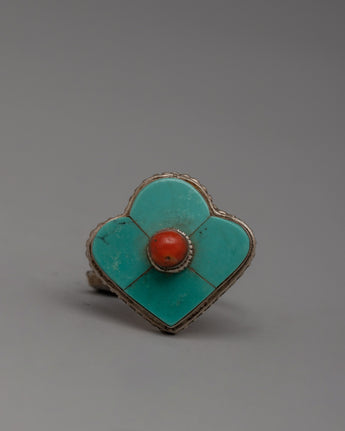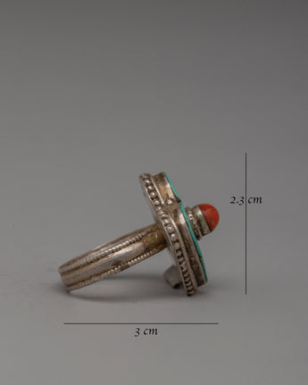 This gorgeous handcrafted silver coral and turquoise ring will add a touch of striking elegance to your collection. This individual handmade design, which is made of 92.5 sterling silver with copper styles, is a striking and attractive statement piece that includes original coral and turquoise stones. This ring is beautiful and easy to wear, measuring 2.3 cm in height, 3 cm in width, and 11 mm in diameter. It weighs 0.004 kg.