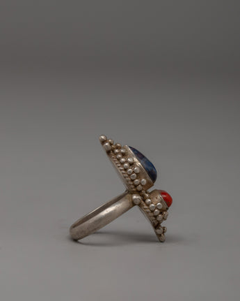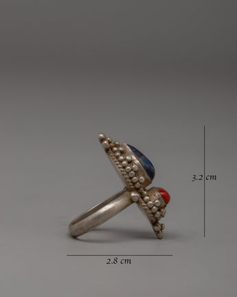 More than just a piece of jewelry, this stunning handcrafted ring is a profound symbol of spiritual and cultural significance. It is crafted from 92.5 sterling silver with copper accents and decorated with lapis lazuli and coral stones. This lightweight handmade ring, which measures 3.2 cm in height, 2.8 cm in width, 10 mm in diameter, and weighs only 0.008 kg, is the ideal combination of style, custom, and spirituality.