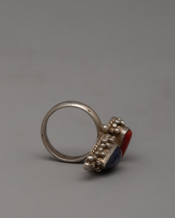 In the past, rings have been worn as personal ornaments, spiritual beliefs, and authority symbols. This ring's lapis lazuli is a stone of truth and wisdom that is highly valued for its capacity to heighten self-awareness and establish a connection between the wearer and higher levels of consciousness. Conversely, coral is a potent element for energy and establishing since it represents life force and protection. These stones work together to provide spiritual clarity, courage, and balance.