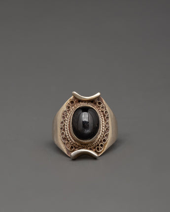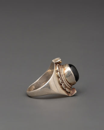 The silver material gives the ring a polished, classic look, while the black gemstone creates a striking contrast that enriches the overall design. The Silver Ring with Black Gemstone is perfect for those who appreciate fine craftsmanship and a touch of luxury, making it an excellent gift or a valuable addition to your collection. Its elegant style and diverse appeal make it suitable for any occasion, ensuring you make an excellent impression wherever you go.