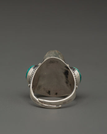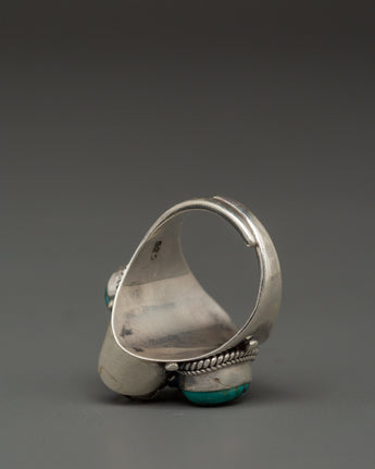 The ring is meticulously crafted to showcase the natural textures and colors of the original stones, which are securely set in polished sterling silver. Its timeless style complements casual and formal looks, making it an excellent accessory for regular or special occasions. This piece exudes craftsmanship and cultural diversity, whether worn alone or with other rings.
