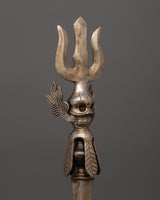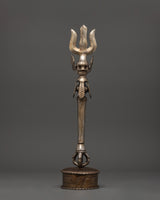 This meticulously made iron Phurba dagger is a symbolic and useful instrument. The three-pronged Trishul signifies the triad of body, speech, mind, and the three levels of life. Its base, formed like a Vajra, represents indestructible power. This sculpture is a powerful addition to any altar, meditation place, or ritual practice.
