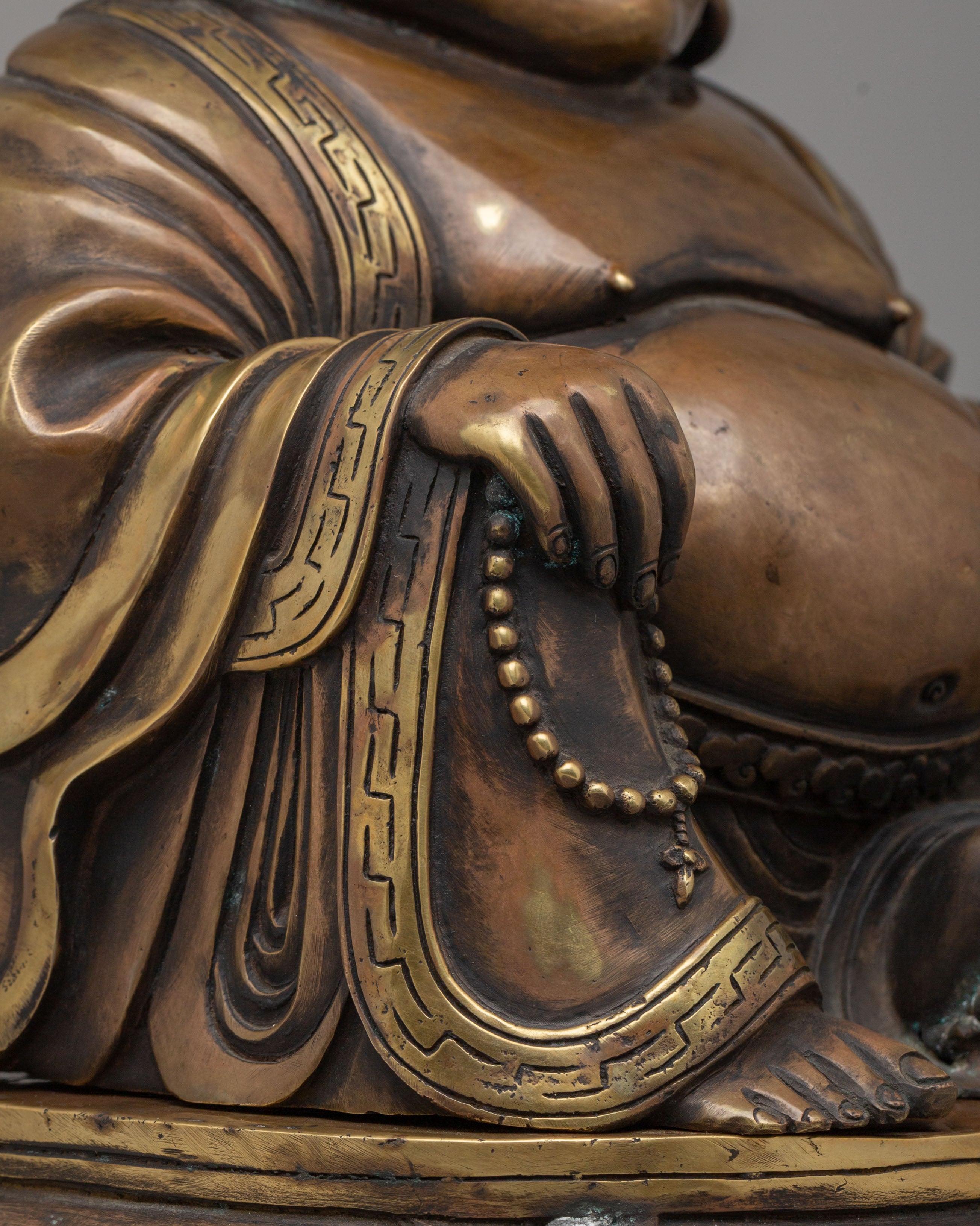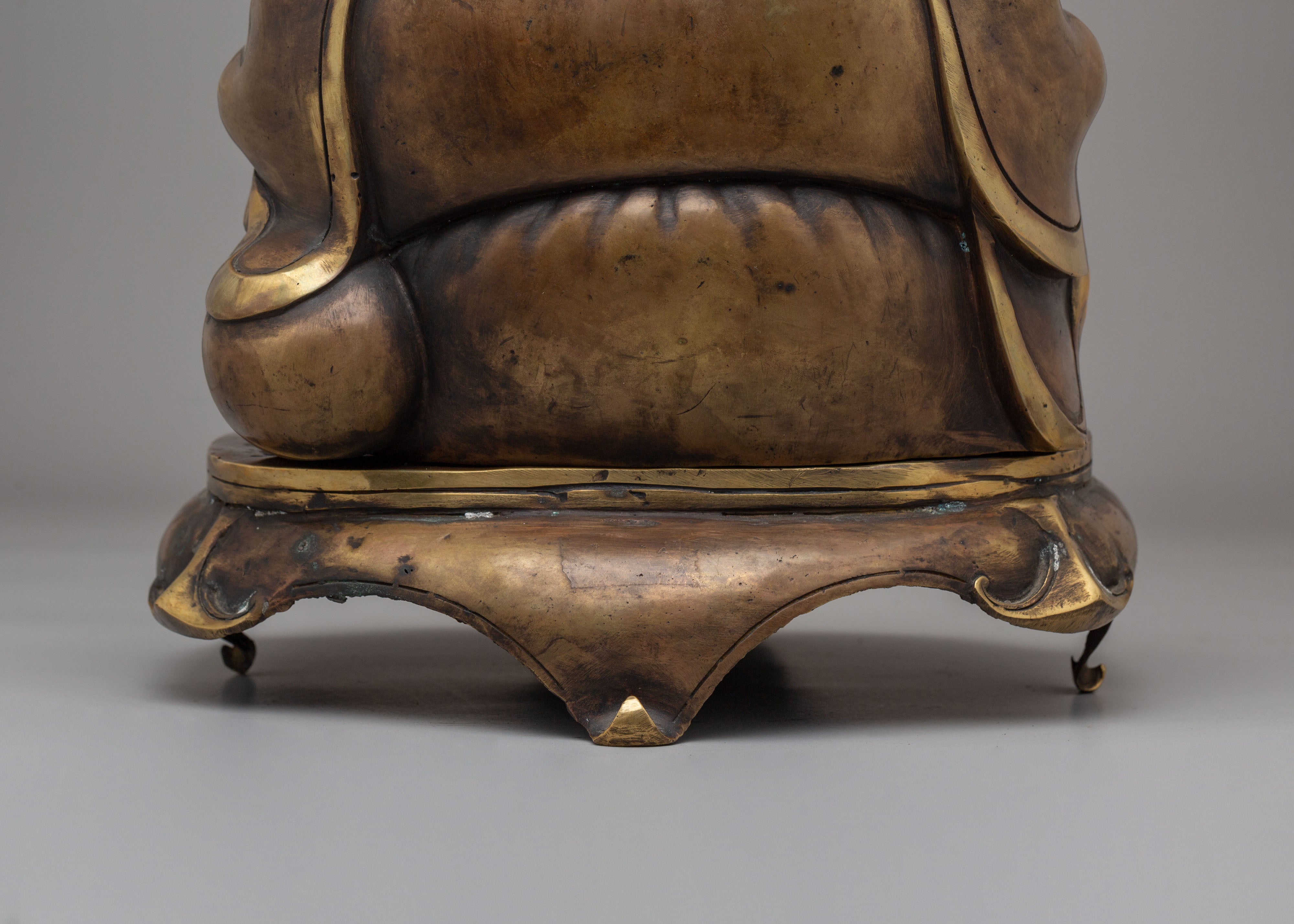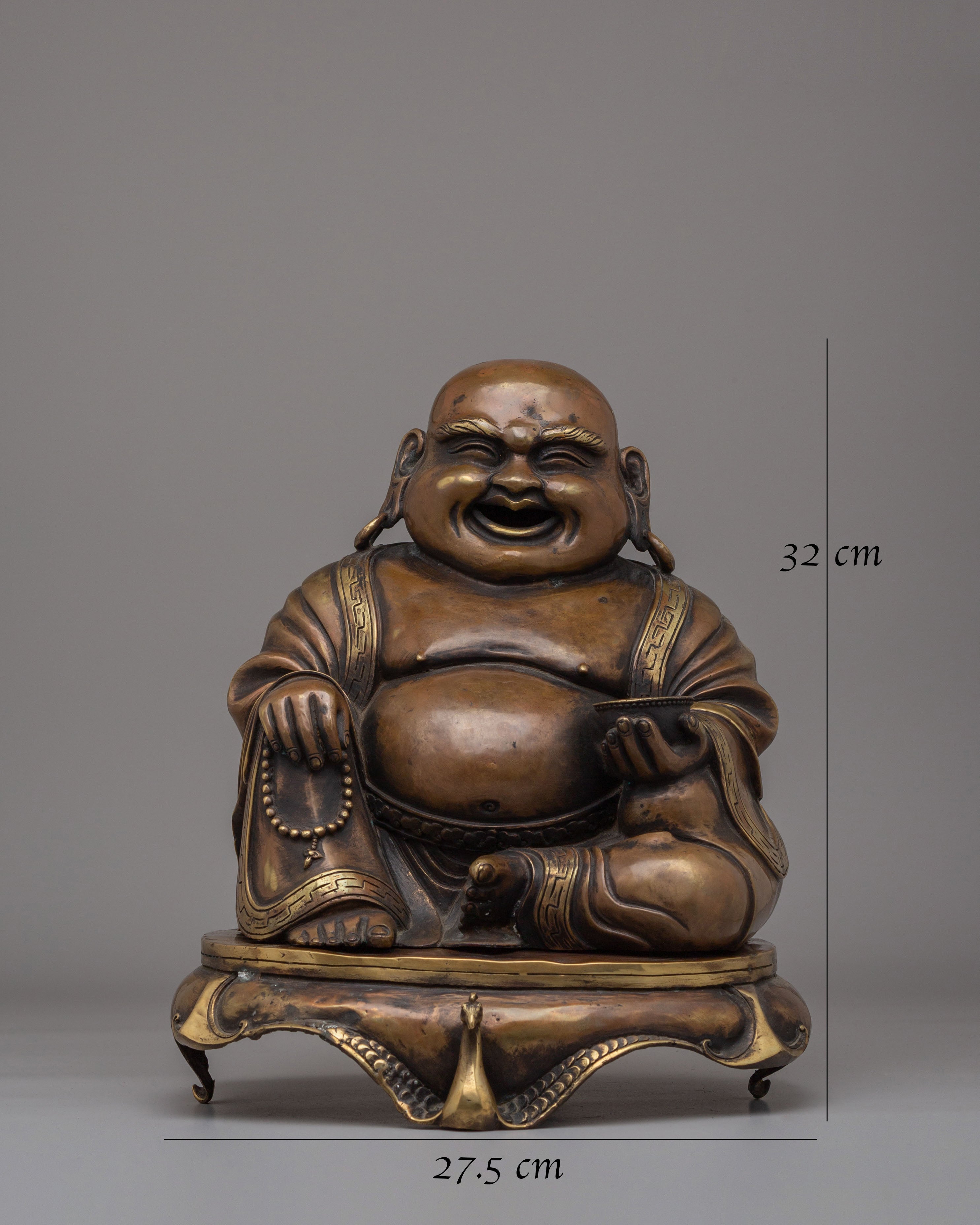 The Copper Laughing Buddha Incense Burner is a sacred decorative piece symbolizing joy, prosperity, and spiritual harmony. Measuring 32 cm in height and 27.5 cm in width, and weighing 4.48 kg, this beautifully crafted incense burner is made from a copper body, reflecting traditional craftsmanship and spiritual artistry. The Laughing Buddha is widely regarded as a symbol of happiness, abundance, and positive energy, making this piece a meaningful addition to meditation spaces, altars, and peaceful home environments.