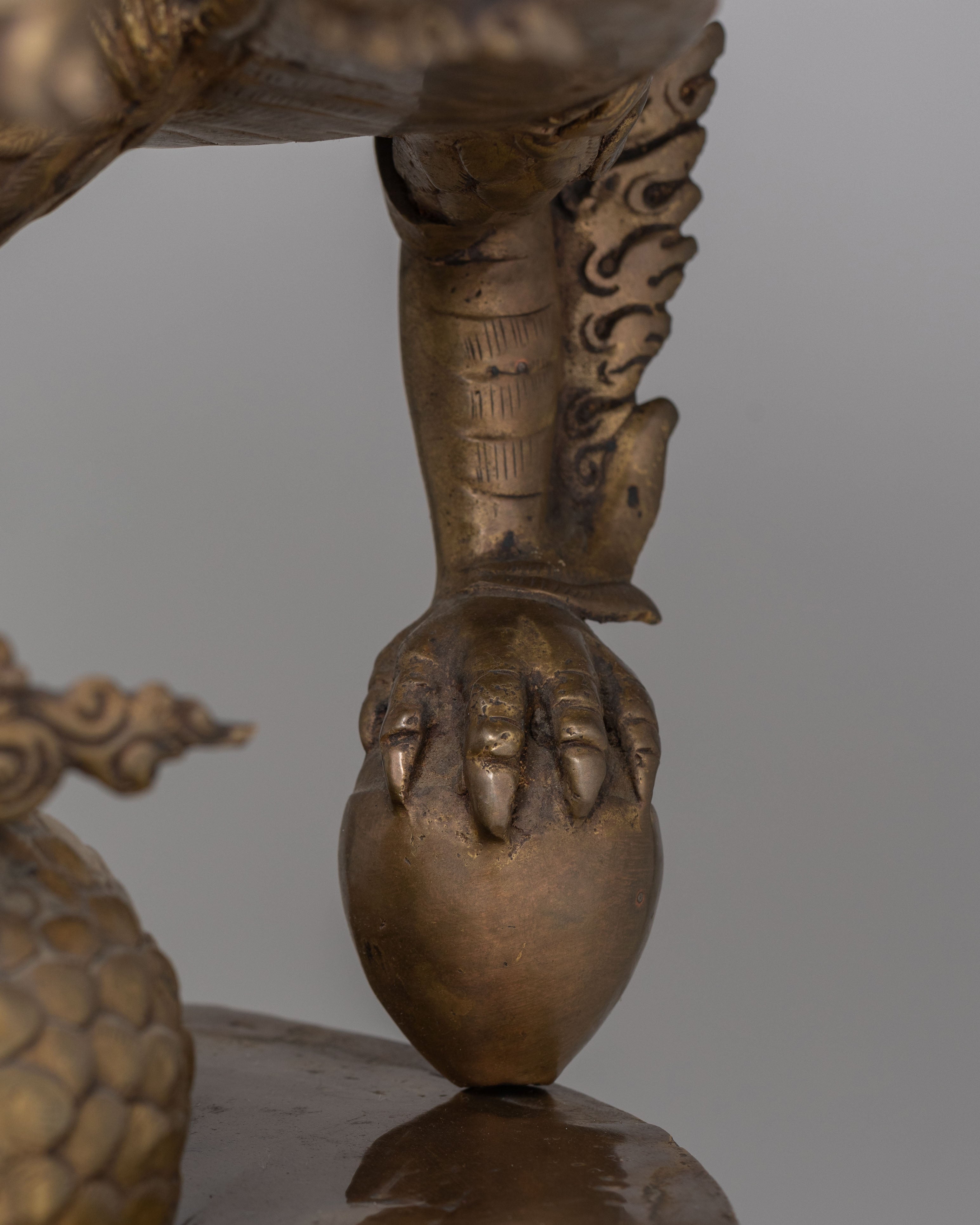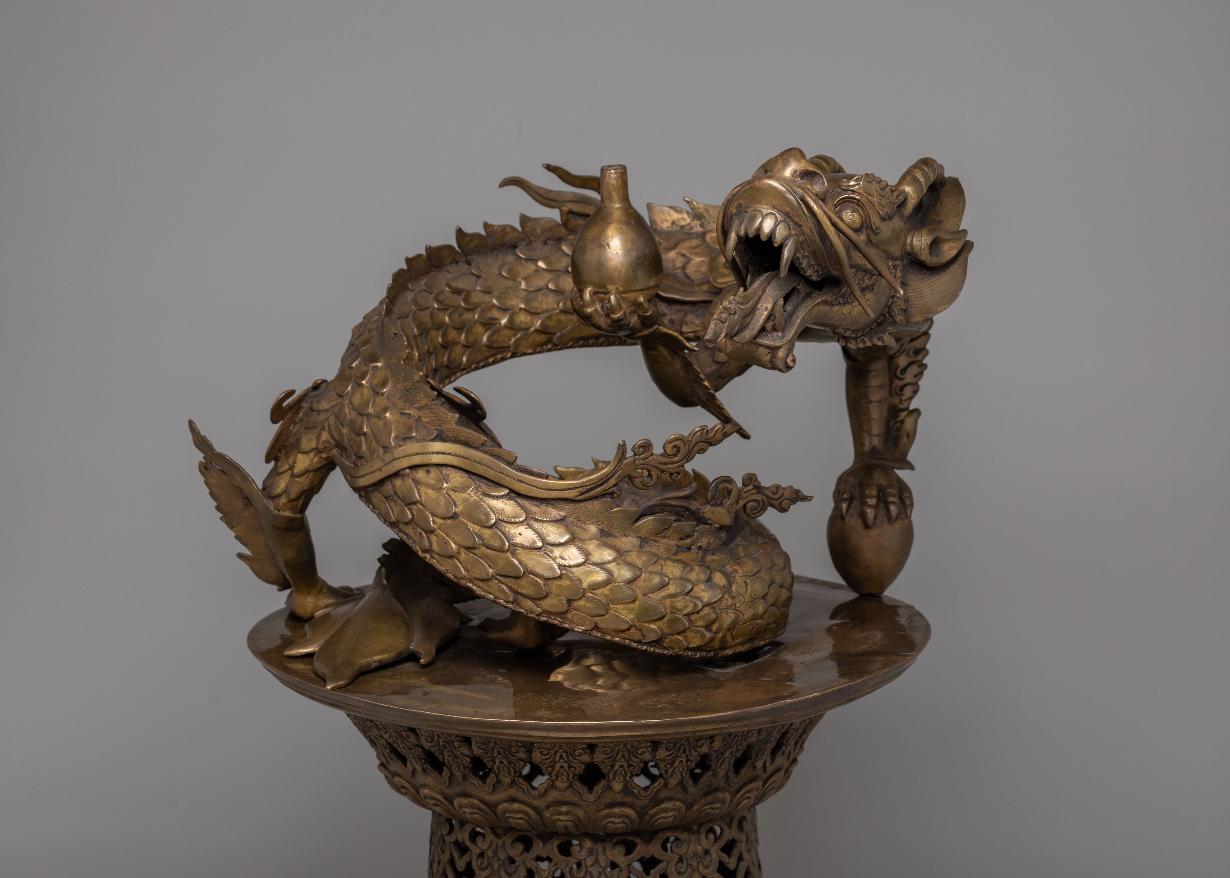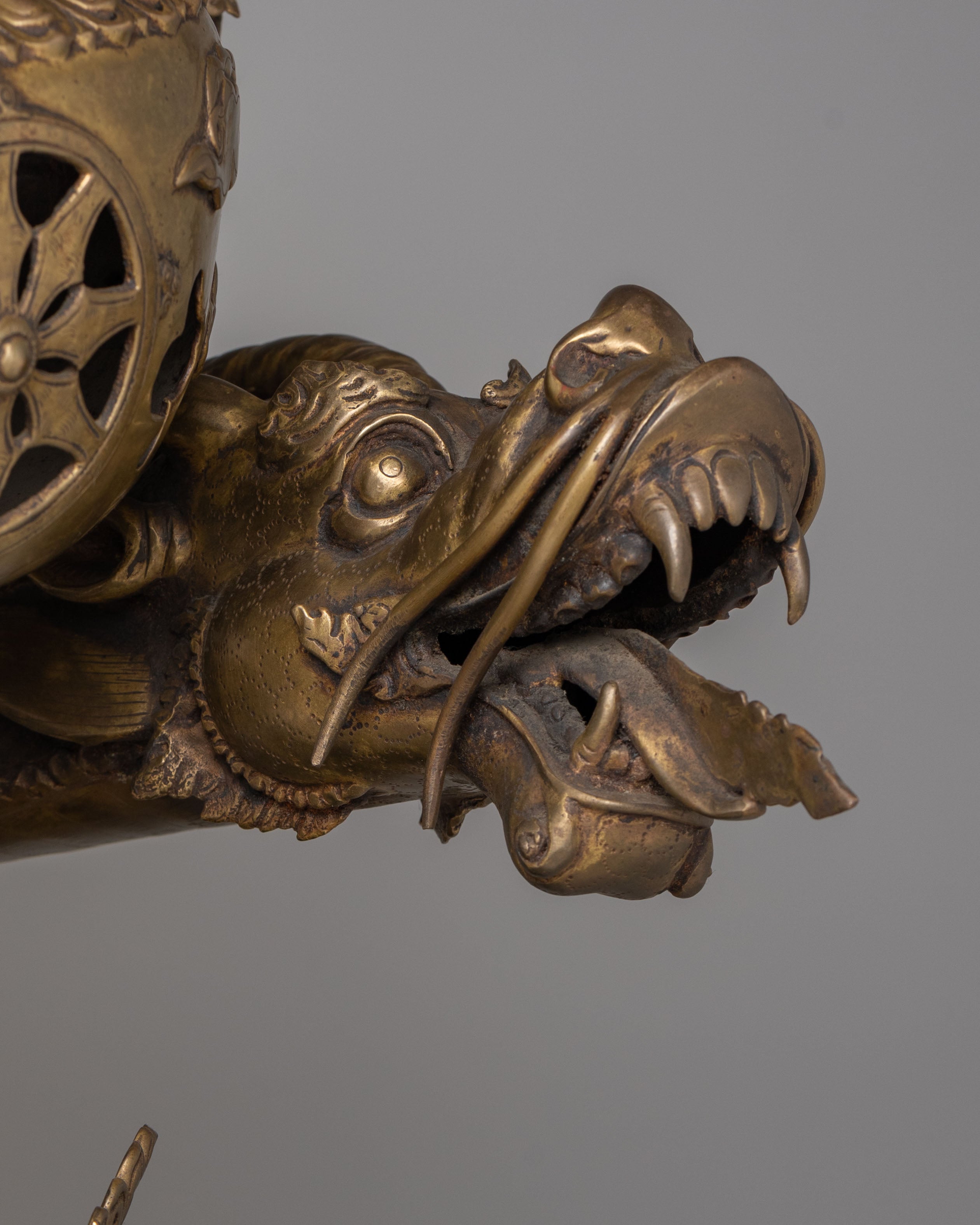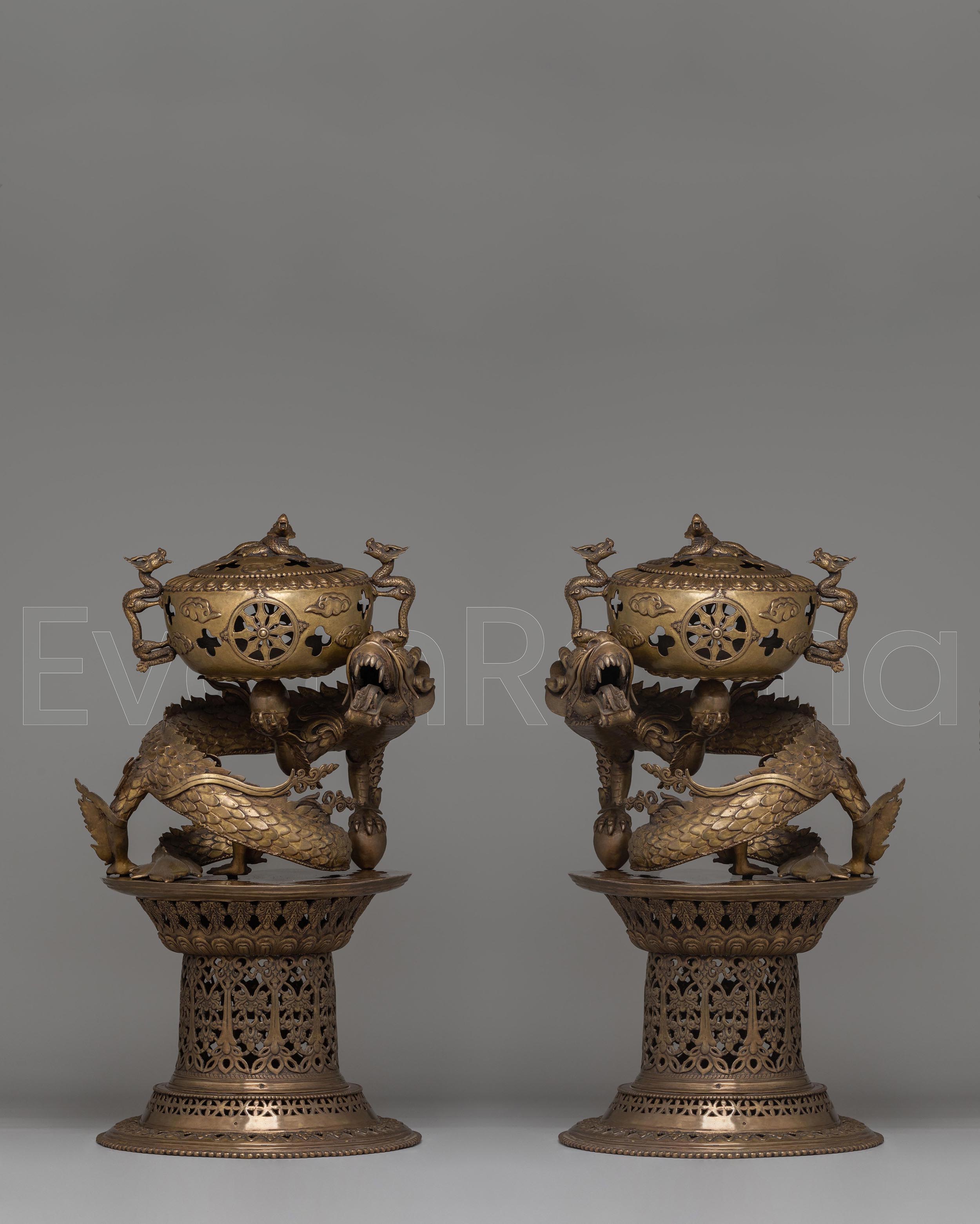 In Buddhist and Himalayan traditions, dragons symbolize wisdom, protection, and the balance of cosmic forces. Used in ritual settings, incense burners like this set are believed to purify space, invite clarity, and honor enlightened energies. This Bronze dragon incense burner set serves as both a sacred ritual object and a powerful altar centerpiece for spiritual ceremonies and offerings.