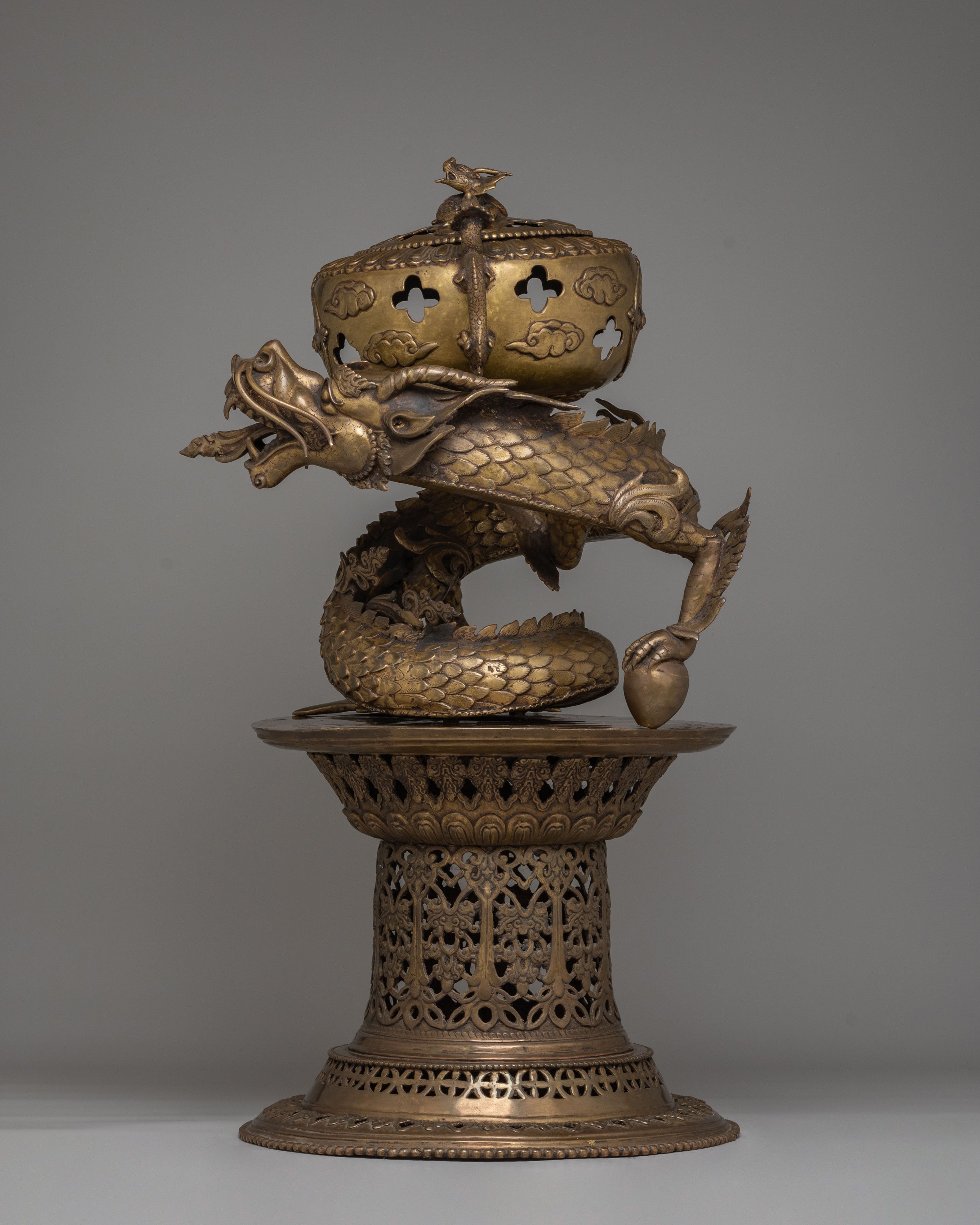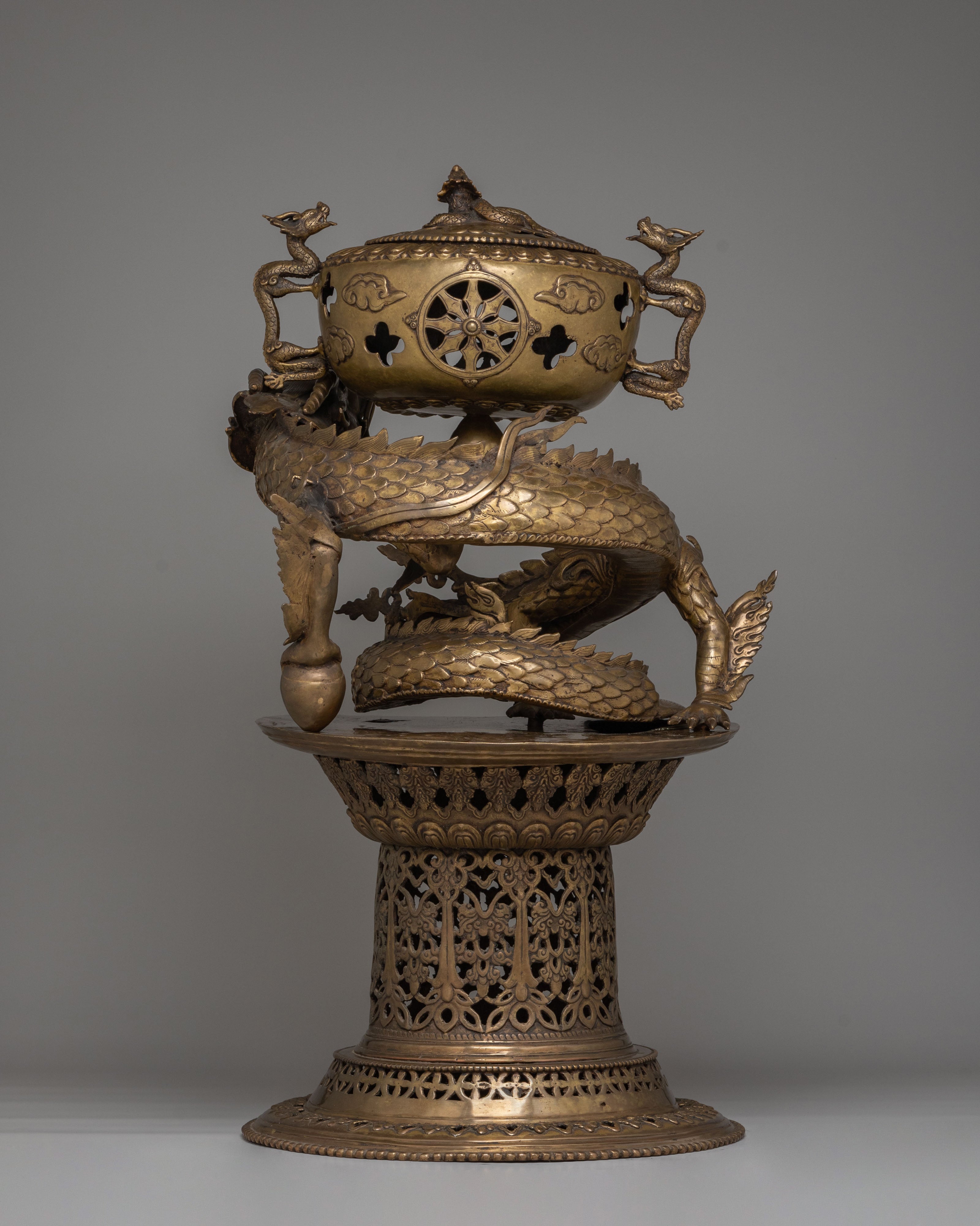 The design features a coiled dragon supporting a finely detailed incense vessel adorned with traditional cutwork openings and symbolic motifs. Dragons rise protectively around the burner, representing guardianship and spiritual authority. The pedestal base showcases intricate openwork patterns, allowing incense smoke to flow gently while highlighting the craftsmanship and ritual intent behind each element.