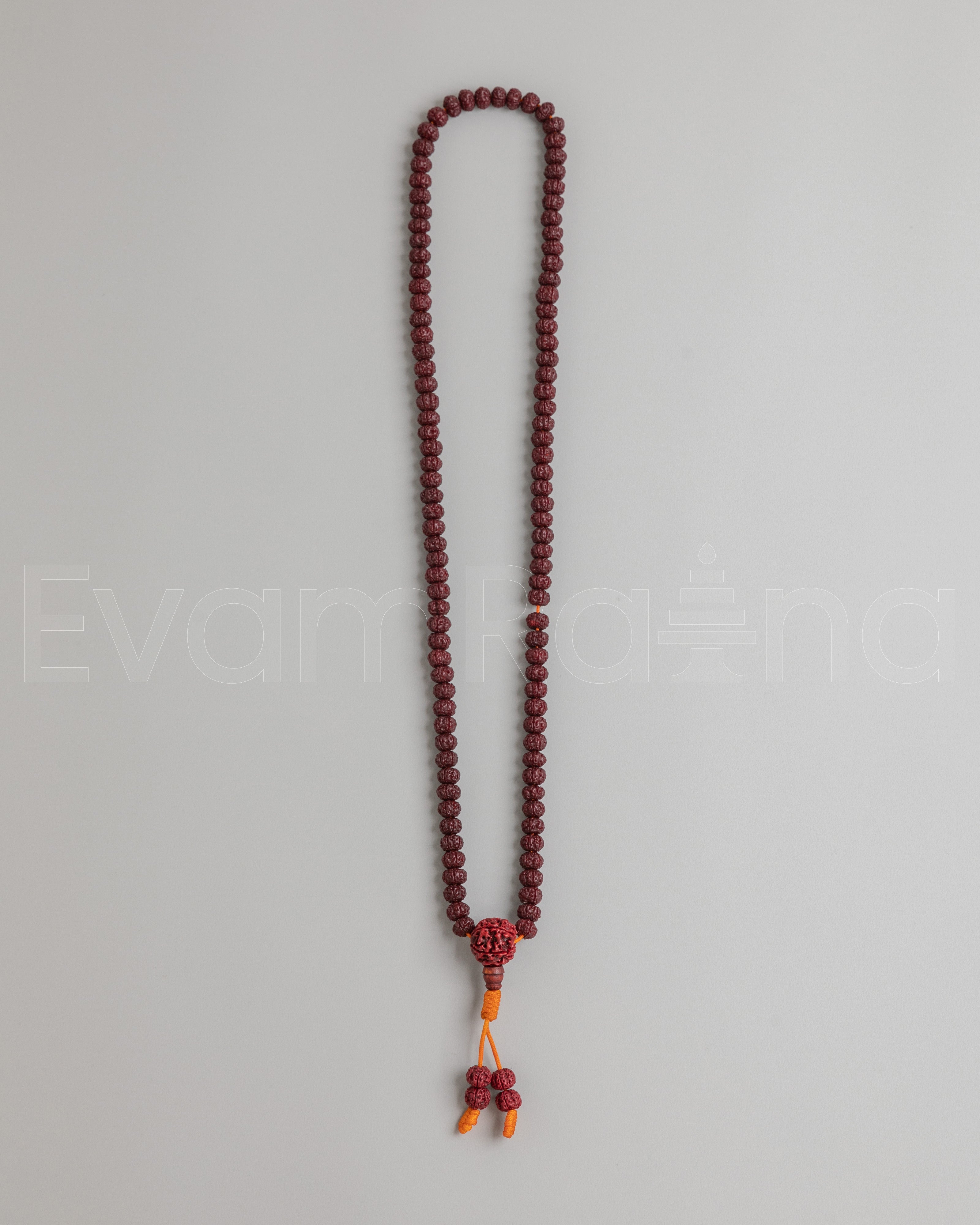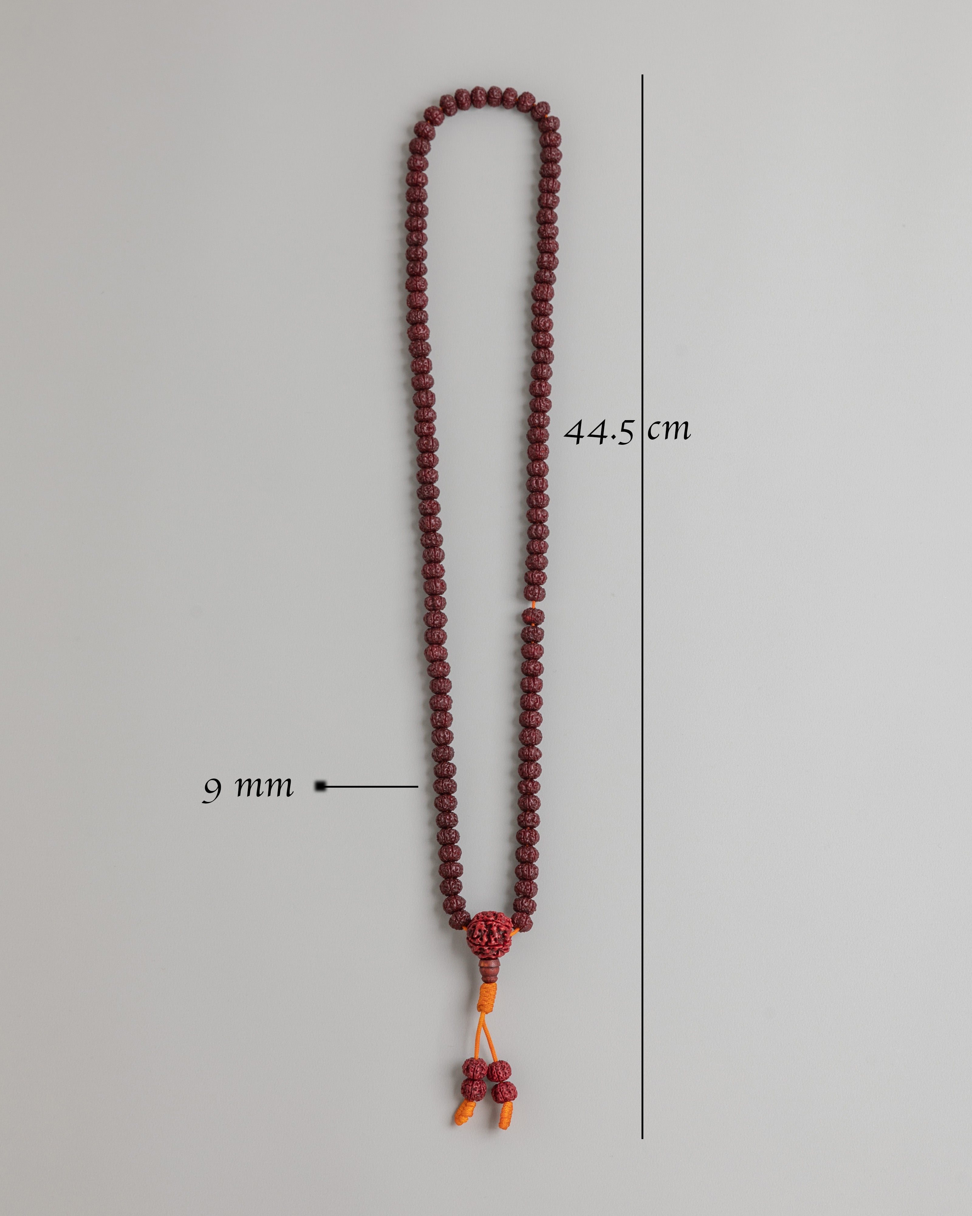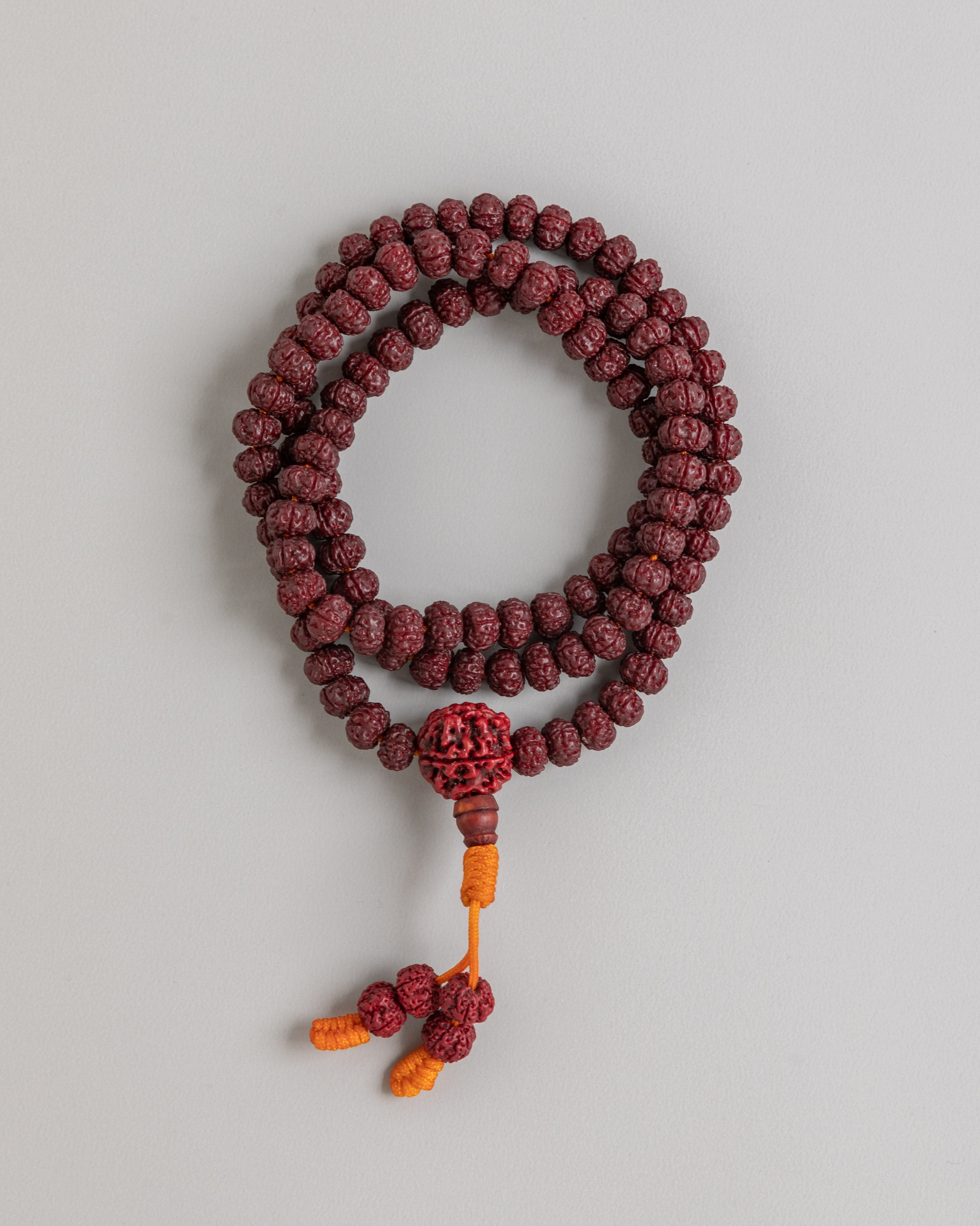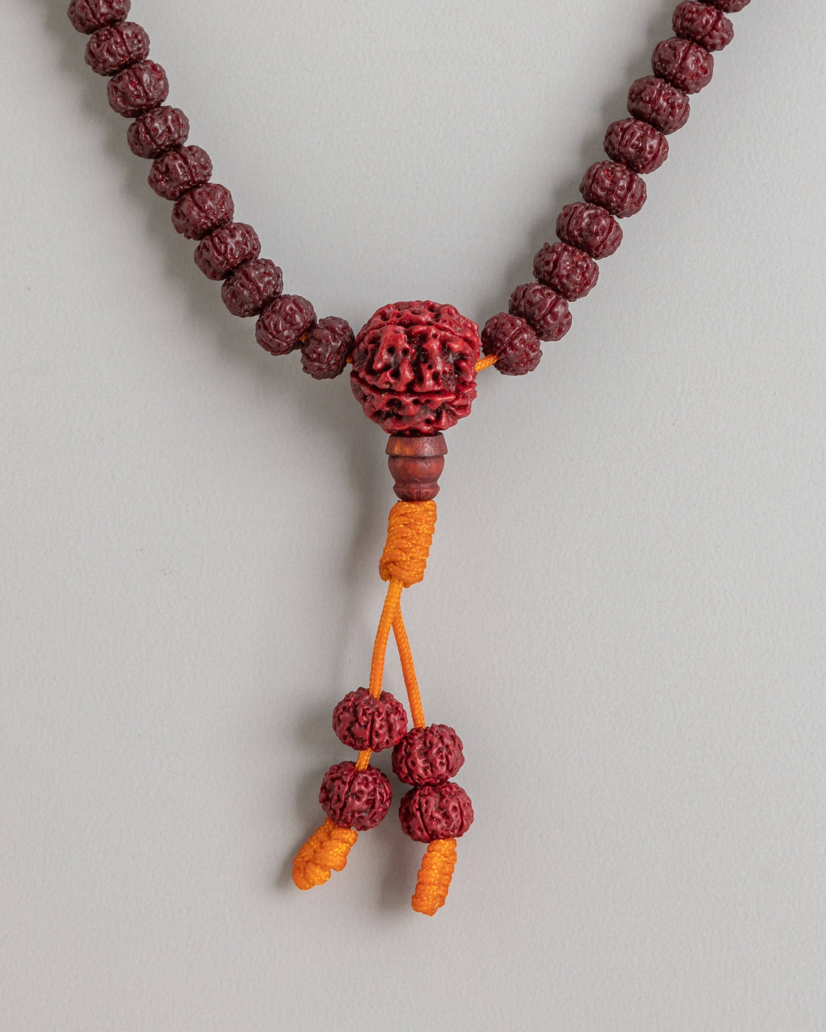 This prayer mala features vibrant Rudraksha beads, known for their deep connection to spiritual growth and healing. The beads' natural texture and earthy brown color make this mala both aesthetically pleasing and meaningful. The necklace is finished with a red-and-orange knot, further enhancing its traditional and spiritual feel. The Rudraksha beads are believed to offer protection and positive energy, making this mala a perfect companion for those seeking to improve their meditation practice or deepen their spiritual journey.