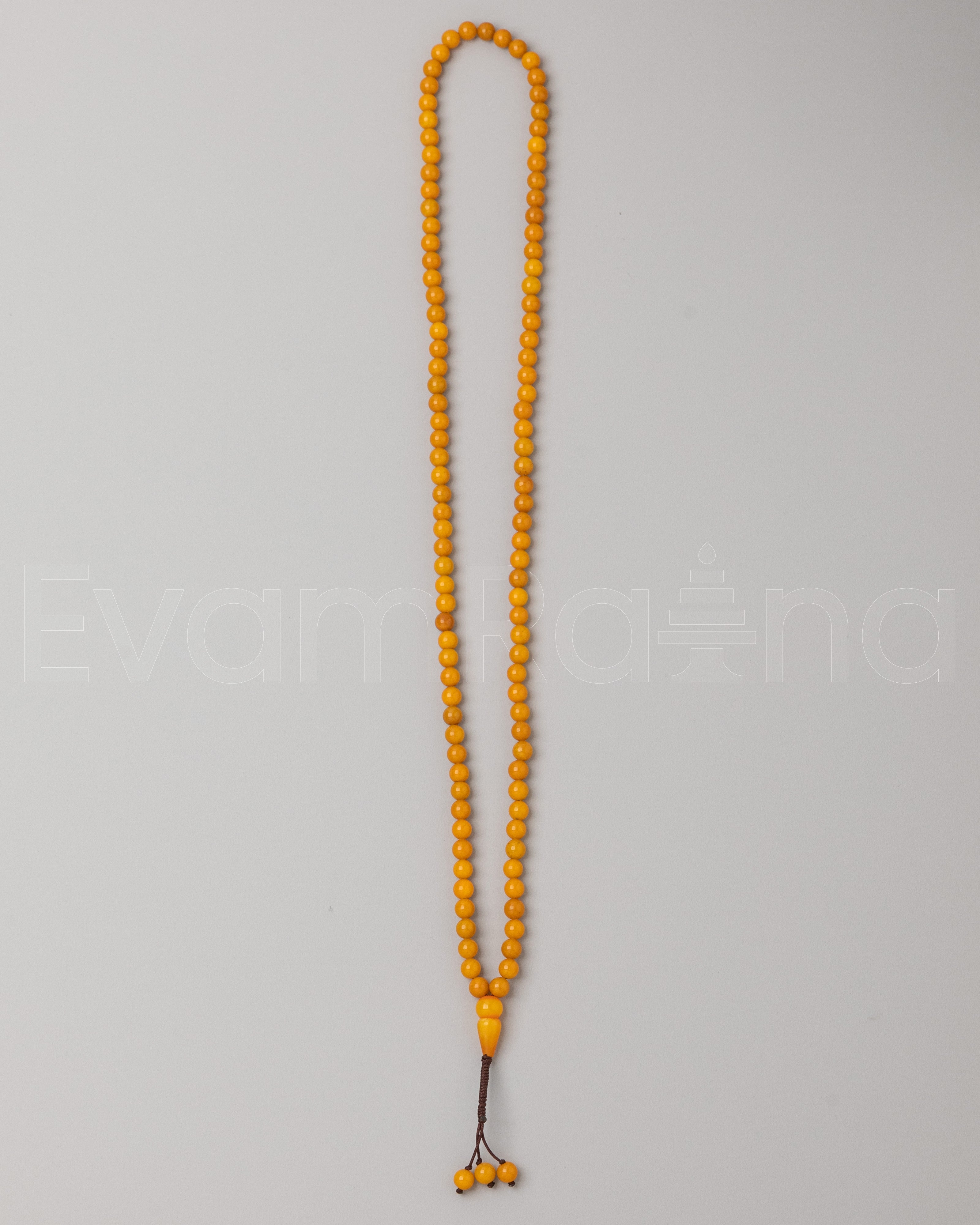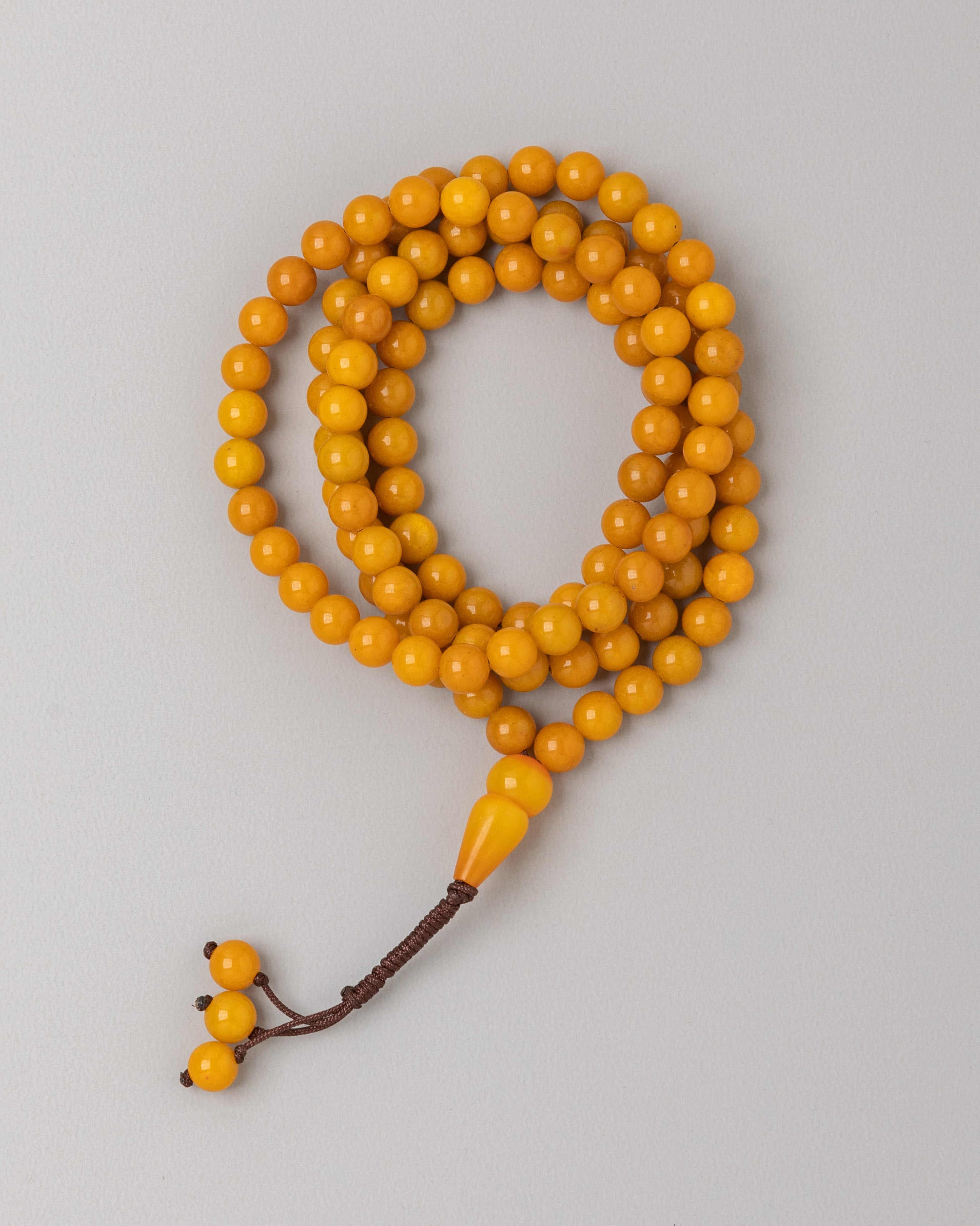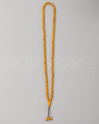 A Buddhist mala, or prayer beads, is a string of beads used to count mantras or prayers during meditation. Each bead is carefully handcrafted from materials such as wood, bone, or gemstones, and they are strung together on a cord or wire. The mala typically features a guru bead at one end, which serves as a marker to indicate the start of the count. As the practitioner recites mantras or prayers, they move one bead at a time, counting each repetition. This tactile method helps maintain focus and rhythm during extended periods of meditation. Additionally, some malas include decorative accents like intricate carvings, gemstone spacers, or a tassel at the end, enhancing both their functionality and aesthetic appeal. A Buddhist mala is a valuable tool for tracking and deepening meditation practice, offering a tangible connection to spiritual growth and mindfulness.