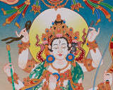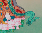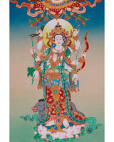 A stunning Goddess of Dawn, Marichi Thangka, is hand-painted in the traditional style by a skilled Nepali artist, capturing the goddess's divine essence in every detail. High-quality cotton canvas supports vibrant acrylic colors, with 24K gold highlighting her radiant presence. Marichi, the Goddess of Dawn, symbolizes enlightenment, protection, and spiritual awakening, shining with the serenity of the rising sun.
