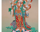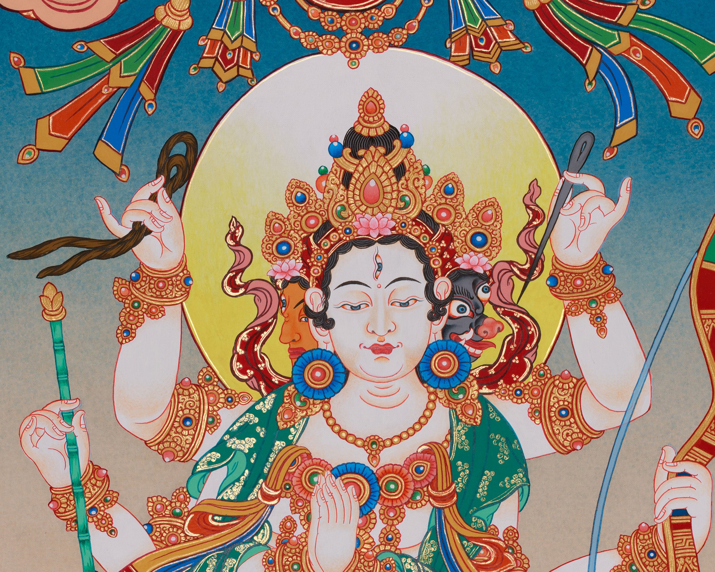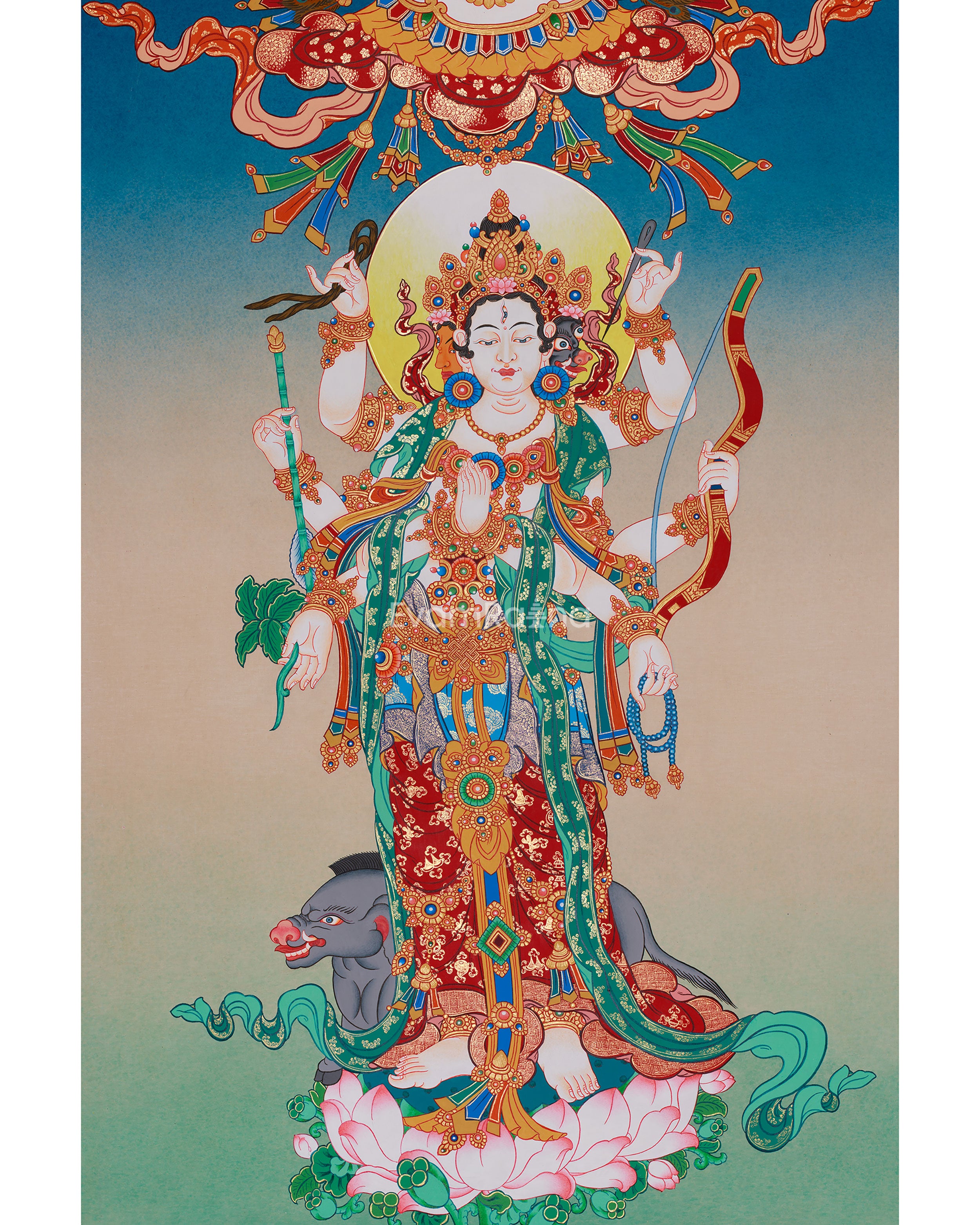 In this thangka, Goddess Marichi is depicted standing on a lotus seat, embodying divine grace and power. She has three heads and eight hands, each holding sacred tools that represent her multifaceted nature and her ability to overcome obstacles. A boar rests at her feet, symbolizing stability and strength, further emphasizing her protective role. Above her, a parasol is shown, offering a shield that signifies her power to provide refuge and security to her devotees. Her serene yet powerful presence is highlighted by the golden aura, symbolizing the dawn of wisdom and enlightenment.