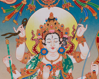 The thangka showcases Nepali workmanship, combining traditional techniques and materials to produce a piece that is both rich in spiritual meaning and visually captivating. Every brushstroke is thoughtfully applied to bring out Marichi's strength, elegance, and wisdom, turning this thangka into a cherished treasure for anyone seeking spiritual protection and inspiration.