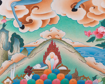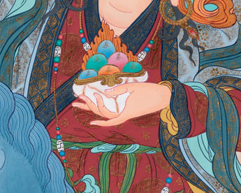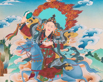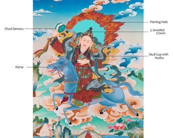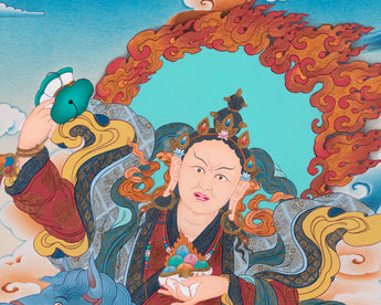 Discover the profound wisdom and spiritual grace of Achi Tsogyal Thangka, the revered female master in Tibetan Buddhism, through this captivating thangka painting. She is a significant figure in Vajrayana practice, renowned for her spiritual attainments and role as Guru Padmasambhava's foremost disciple. This thangka beautifully depicts her in meditation posture, exuding a sense of inner tranquility and profound insight. With her right hand holding a damaru and her left hand a skull cup, she embodies both compassion and fierce determination. The vibrant acrylic colors and intricate details on cotton canvas bring her presence to life. As a symbol of enlightened feminine energy, Achi Tsogyal's image inspires devotion and empowers practitioners on their spiritual journey.