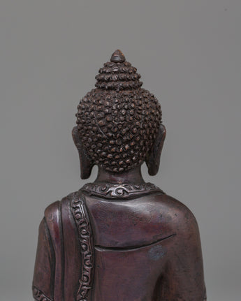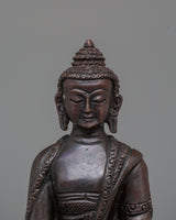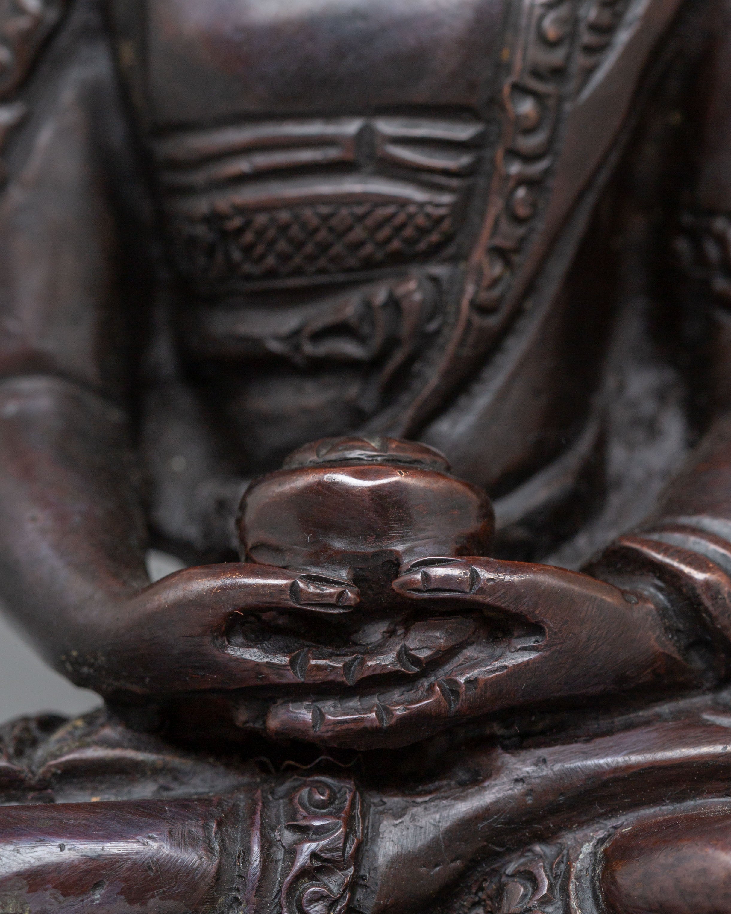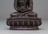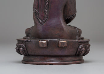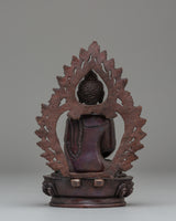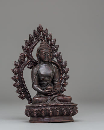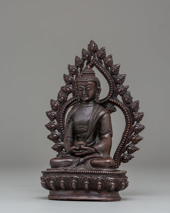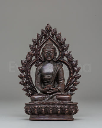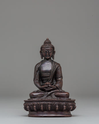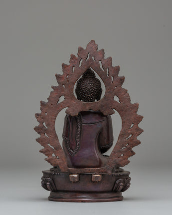 The Amitabha Buddha of Eternal Peace Sculpture stands 18 cm tall and has a base width of 12.5 cm. Crafted from an oxidized copper body. Crafted by expert artisans, this item embodies the rich traditions of Himalayan Buddhism, making it a valuable addition to altars, meditation spaces, or sacred collections.