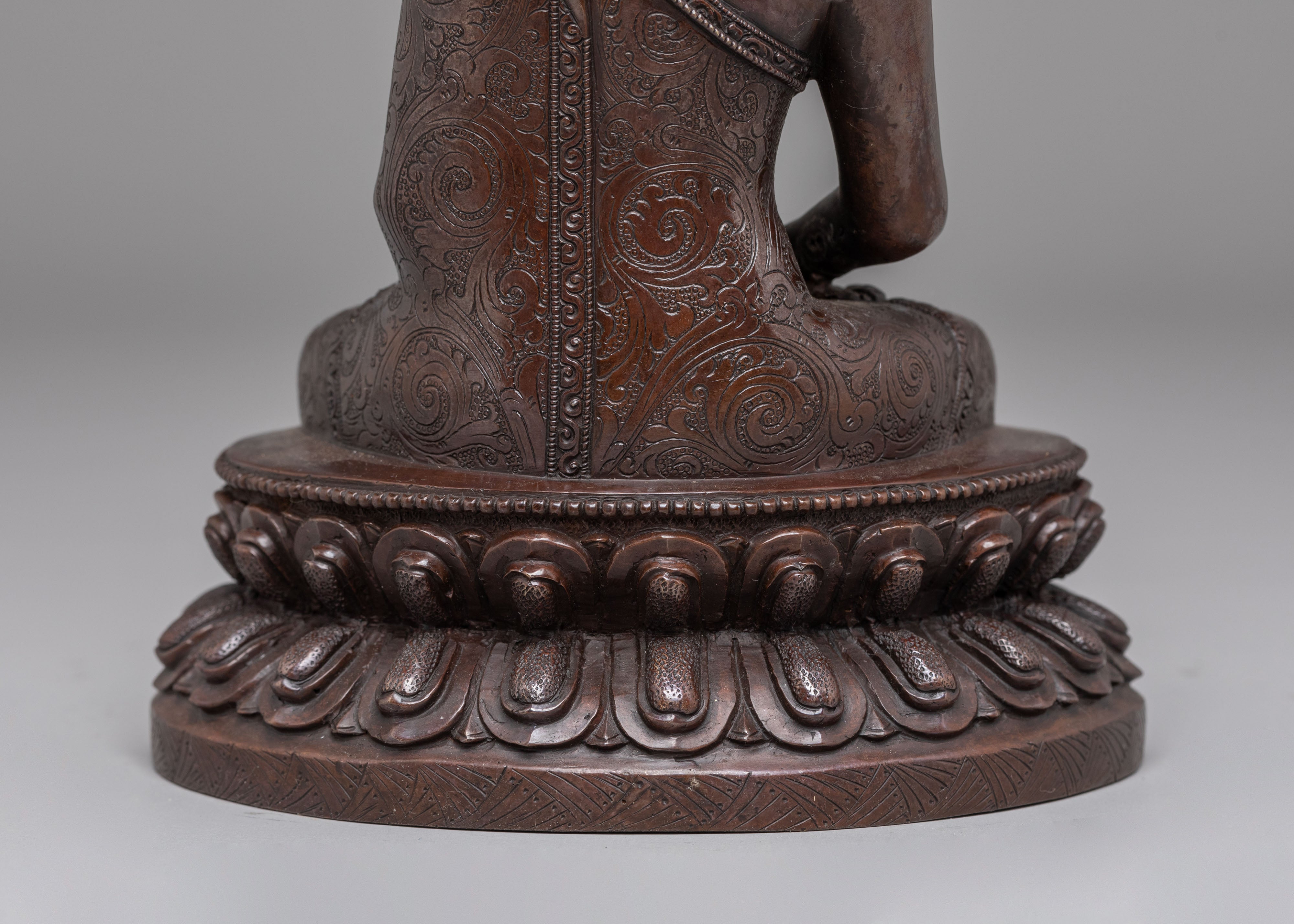 This Amitabha Buddha statue is an intricately handcrafted piece produced in our studio and designed with unique Nepali motifs. This is entirely comprised of oxidized copper, giving it its final elegant look. Here in the statue, the Buddha can be seen peacefully sitting upon a moon disc lotus with an alms bowl over his lap, carried by his two hands, which are in the precise position of a 'Dhyan Mudra,' a characteristic hand gesture of Amitabha Buddha.