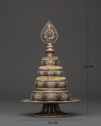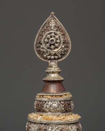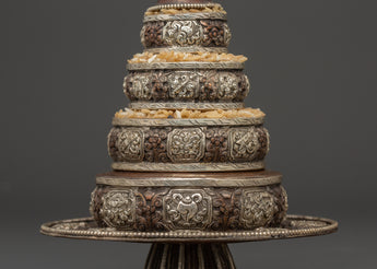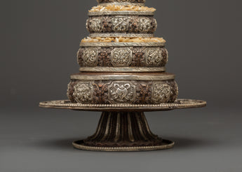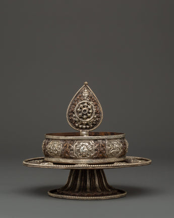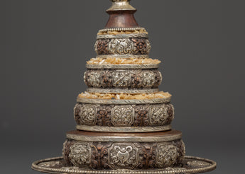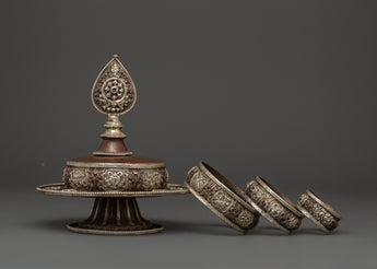 The Auspicious Symbol Engraved Mandala is a beautifully made ceremonial offering set that captures Tibetan Buddhism's holy and auspicious symbolism. This mandala, measuring 24cm in height and 14cm in breadth, is meant to improve your spiritual practice and serve as a highlight at your altar or meditation place. Made of oxidized copper and silver plating, the mandala has stunning engravings of religious symbols, each symbolizing a distinct aspect of spiritual growth and enlightenment. The rich workmanship adds beauty and significant impact to your environment, and the 9cm mandala width and 0.37kg weight make it suitable for both big and small altars.