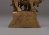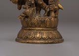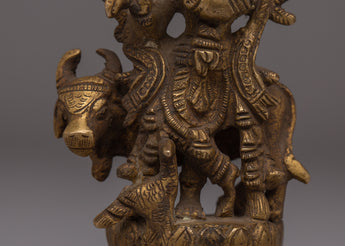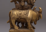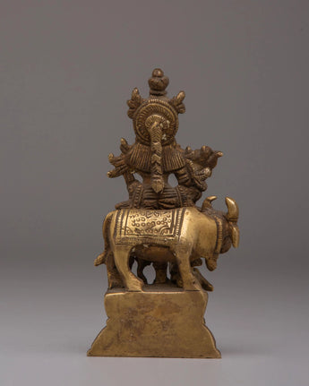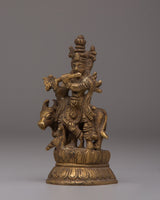This Brass Statue of Krishna depicts the god in his classic pose, sitting on a cow, playing the flute, with a peacock beside him, a common motif associated with Krishna's playful nature and divine beauty. The brass body enhances the statue’s timeless appeal, while the fine details in the clothing and accessories, such as Krishna’s crown, are carefully crafted to reflect his divine essence. The flute symbolizes Krishna's enchanting music that draws all beings into the divine flow, while the presence of the cow and peacock adds a sense of harmony and connection to nature.
