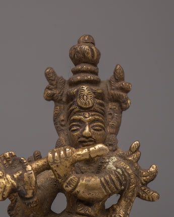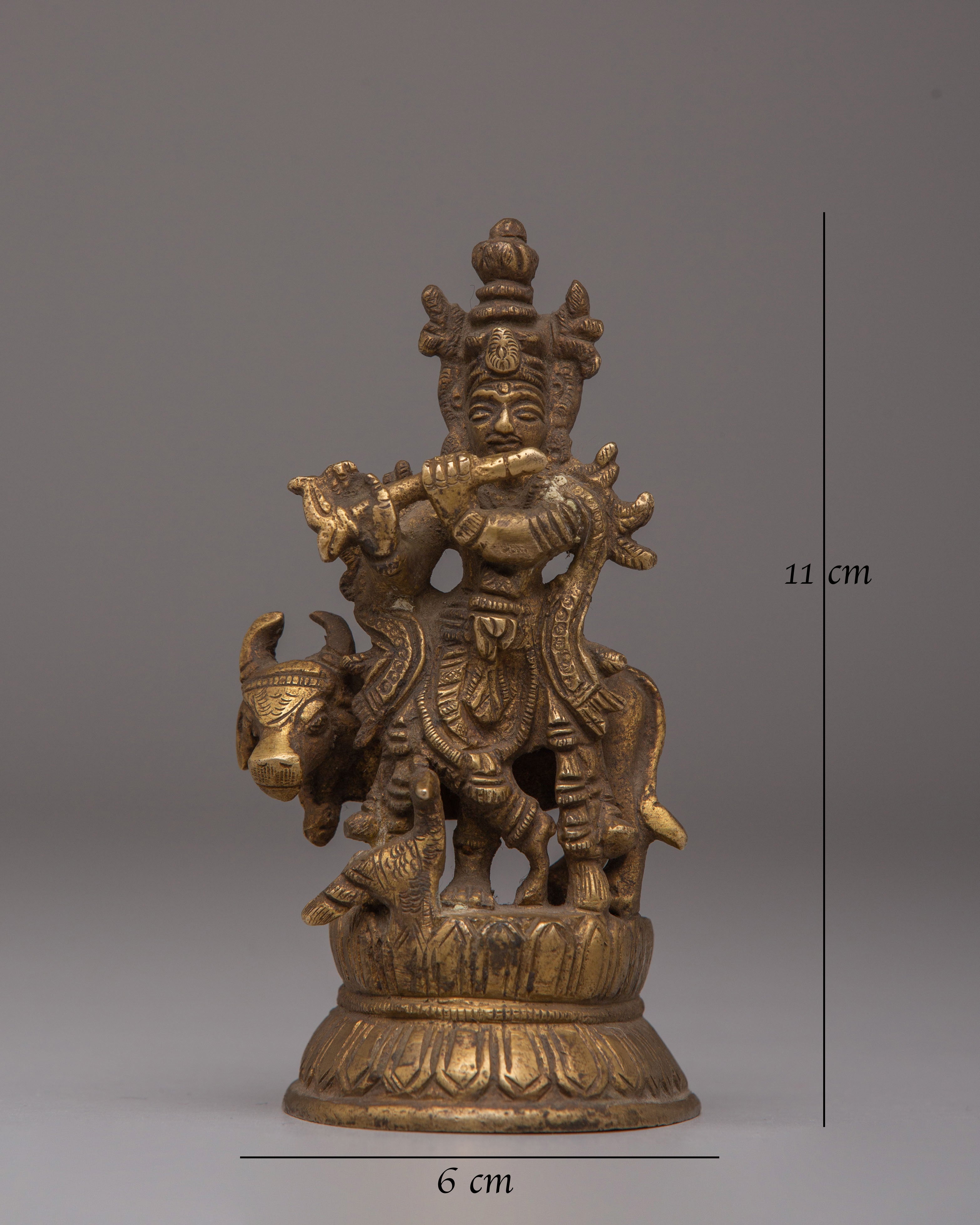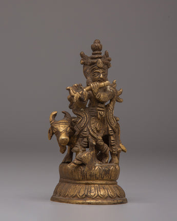 Handcrafted Brass Statue of Krishna with Flute and Cow