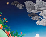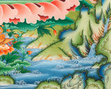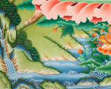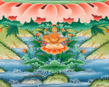 This Buddhist Deity Manjushri Thangka is a superb representation of the Bodhisattva of Wisdom, distinguished by its balanced composition and excellent details, and it is created in the elegant Eri Style. To create vivid gradients that give the deity's robes depth and substance, the artist used acrylic colors. Intricate folds of the fabric are accentuated by the careful layering of rich golden and red tones, producing a realistic and noticeable look. The lotus throne encircling Manjushri and the halo behind his head are accentuated with 24K gold accents, highlighting his divine presence with a dazzling shine. Delicate clouds, flowing rivers, and serene landscapes are depicted in the background, which is painted in delicate blues and greens to symbolize the knowledge and tranquility that emanate from the Bodhisattva. By carefully employing Eri style, the thangka's spiritual potency is increased and the celestial and earthly aspects are harmoniously balanced.