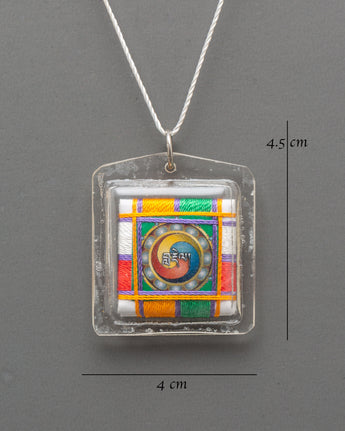 Skilled artisans wrap vibrant threads around a sacred image and seal it in a plastic cover for everyday use. Size 4.5cm (H) x 4cm (W); weight 0.006kg. Materials: Plastic Cover, Canvas, Thread. Compact, colorful, and lightweight, this buti travels easily while adding a touch of Himalayan spirituality to your space.