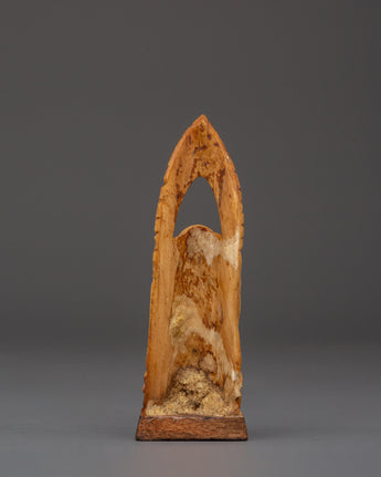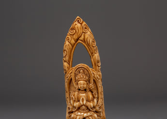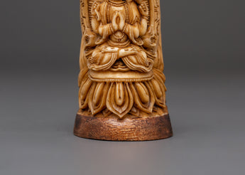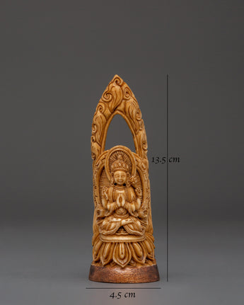 This Chenrezig Bone Hand-carved Statue represents a compassionate being renowned for its unwavering eye. It is 13.5cm tall and 4.5cm wide, made of ethically sourced yak bone, and placed on a wooden base. The statue, weighing only 0.054kg, portrays Chenrezig, the Bodhisattva of Compassion, in a tranquil meditation stance with hands in the prayer motion (Anjali mudra), representing loving-kindness and mercy.