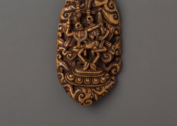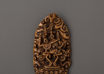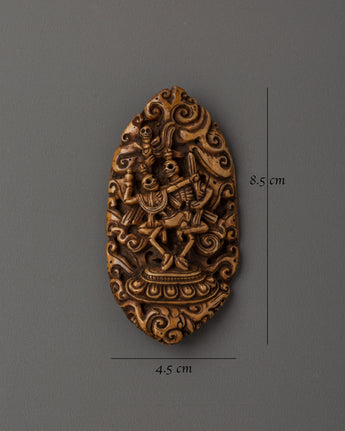 This Citipati Statue is a fine representation of the Lord of the Cemetery in Tibetan Buddhism. This statue is 8.5 cm tall, 4.5 cm wide, and weighs 0.034 kg. It is made of Ethically Sourced Buffalo Bone. The beautiful carving depicts a dancing skeletal pair surrounded by intricate patterns representing the ethereal dance of life and death. It's a great complement to personal altars, meditation places, or as a portable spiritual charm. Its unique workmanship and symbolic importance make it a great gift for spiritual searchers and admirers of traditional Tibetan handicrafts.