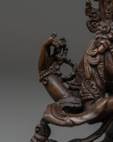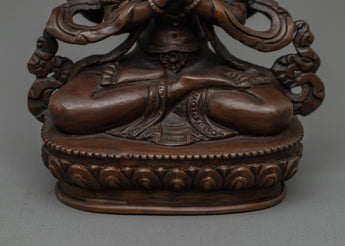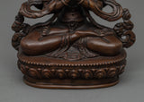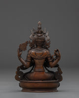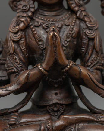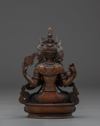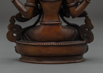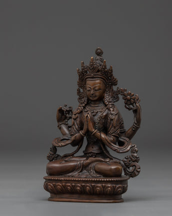This Buddhist Compassion Bodhisattva Chenrezig Handcrafted Statue, also known as Avalokiteshvara, stands at 5.5”/14cm in height and 3.9”/10cm at the base, weighing 0.56 kg. Made from an oxidized copper body, this piece features a rich, earthy finish that highlights its intricate craftsmanship. Created by skilled Nepali artisans, it serves as a meaningful representation of compassion and is ideal for personal altars, meditation spaces, or sacred decor settings.