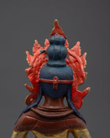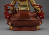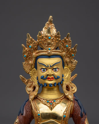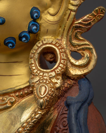 Copper Dzambhala Figurine measures 12.2 inches (31 cm) in height with an 8.7-inch (22 cm) base and weighs 2.95 kg. Crafted from a copper body, it is adorned with 24K gold gilding, detailed gold and acrylic paintings, capturing the essence of Dzambhala—the Buddhist deity of wealth and prosperity. This finely detailed statue serves as a powerful symbol for attracting abundance and good fortune, making it a meaningful addition to any spiritual altar or sacred space.