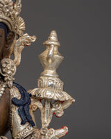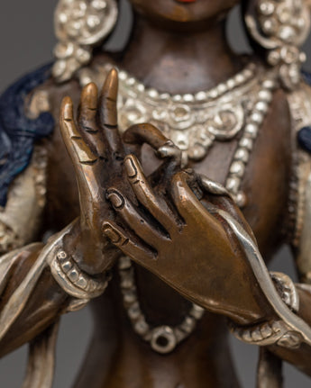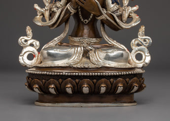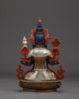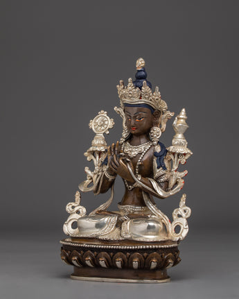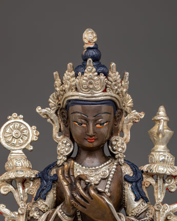The Copper Maitreya Figurine stands 9.1” (23 cm) tall with a 5.9” (15 cm) base and weighs 1.60 kg. Crafted from oxidized copper, the statue features a silver-plated finish and delicate acrylic paintings that enhance its serene and compassionate expression. Representing the Buddha of the Future, Maitreya embodies loving-kindness, hope, and the promise of enlightenment yet to come. This finely detailed statue makes a meaningful addition to any altar or meditation space, inspiring patience, spiritual growth, and universal compassion.