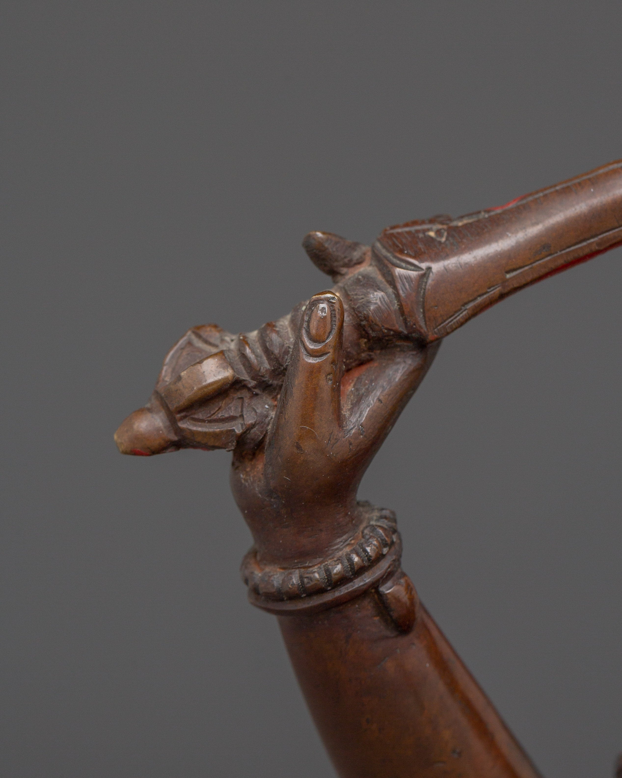 This 21.5 cm Handmade Manjushri Statue stands 8.5” (21.5 cm) in height with a base width of 6.9” (17.5 cm) and weighs 1.45 kg. Crafted from an oxidized copper body and adorned with gold and acrylic paintings and inlaid gemstones, it is expertly handcrafted by skilled Nepali artisans. Reflecting both spiritual significance and traditional craftsmanship, this statue makes a meaningful addition to altars, meditation areas, or personal sacred collections.