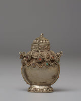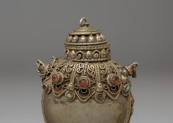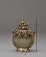 The Copper Snuff Pot is a magnificently constructed object that combines elegance with spiritual significance. This snuff jar is made of copper and plated with silver, and it is embellished with colorful artificial stones such as Lapis Lazuli and Turquoise, which add both beauty and symbolic meaning. Its modest size and detailed design make it ideal for exhibition or ritual use, acting as both a practical and ornamental piece in your home or holy space. Whether employed in traditional customs or as an artistic object, this snuff container promotes balance and tranquillity.