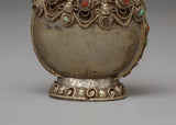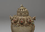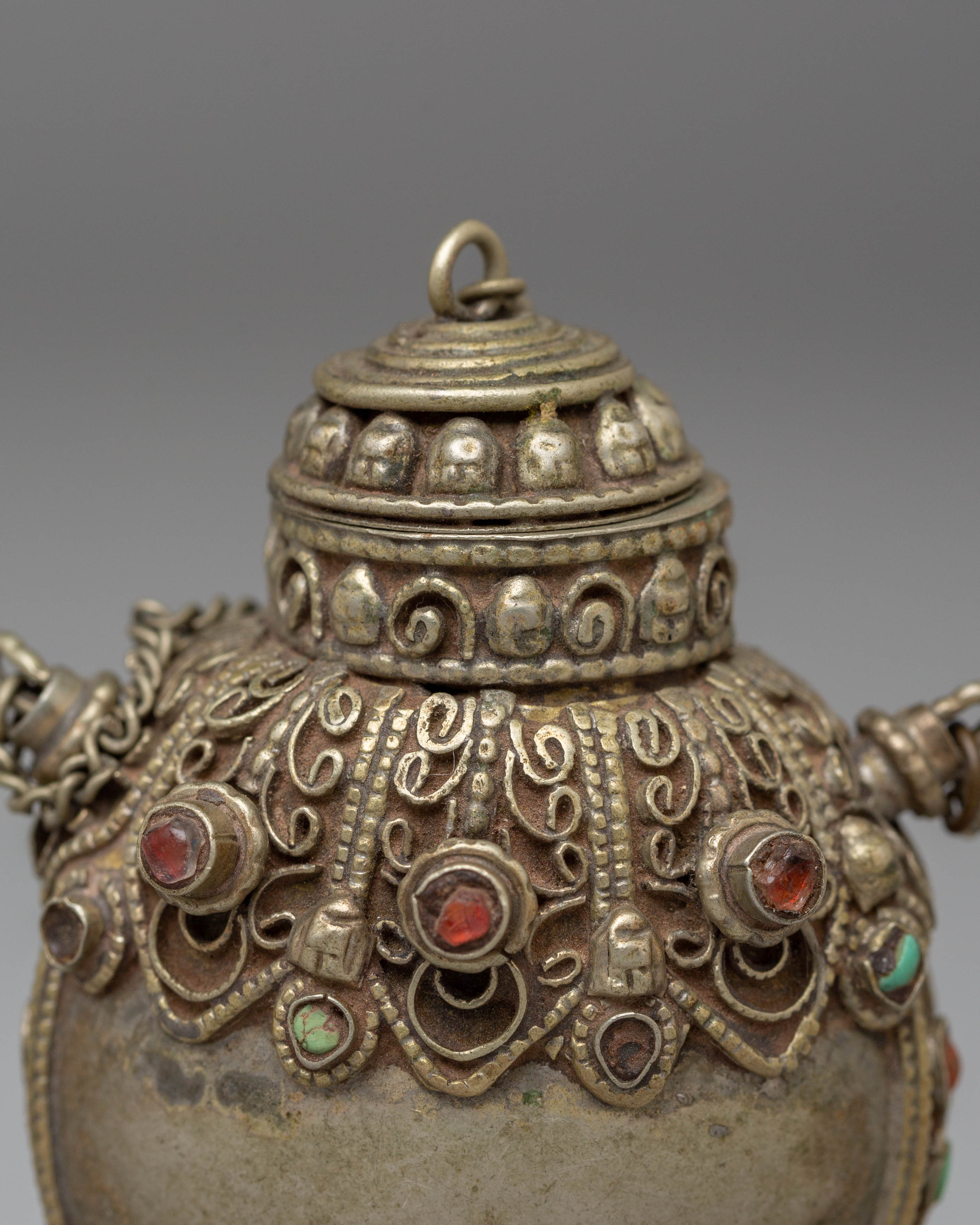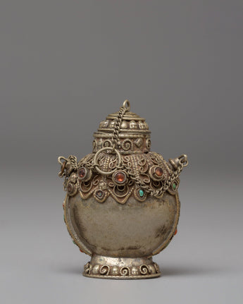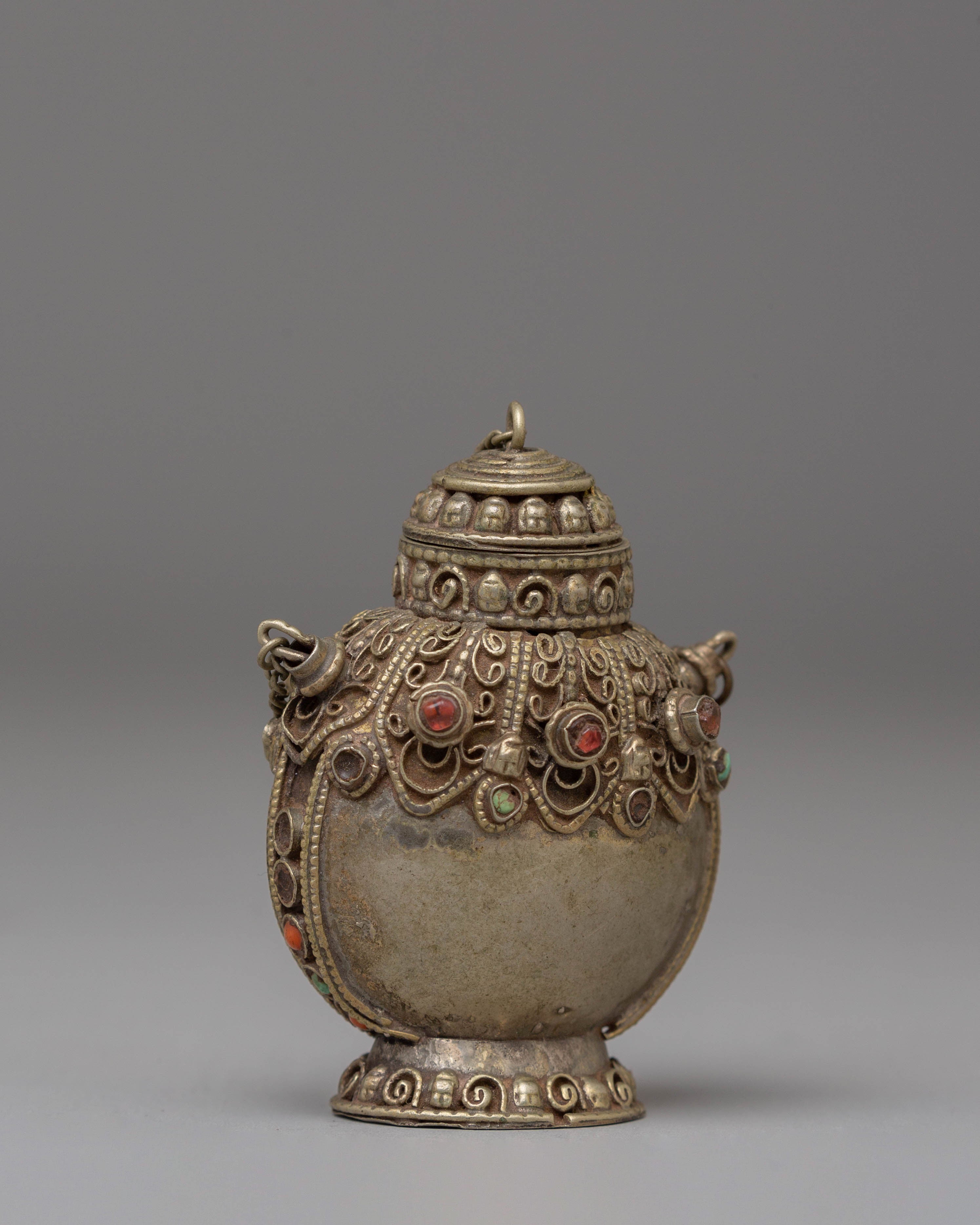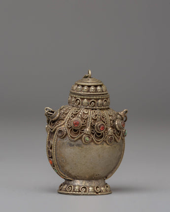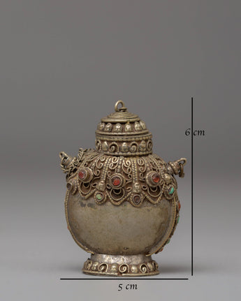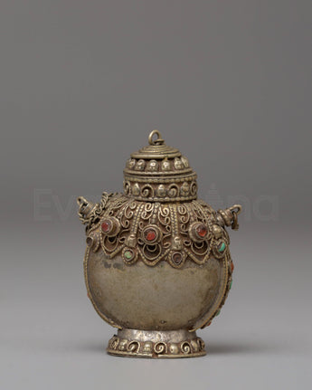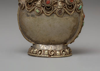 The design features a finely detailed copper body with silver-plated embellishments that create a vintage, ancient look. The stones—Lapis Lazuli, symbolizing wisdom, and Turquoise, known for its healing properties—add a spiritual depth to the piece. The detailed motifs around the body of the snuff pot represent protection, enlightenment, and harmony, making this piece not just visually captivating but also spiritually powerful. Its craftsmanship blends traditional Tibetan artistry with modern elegance.
