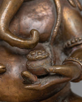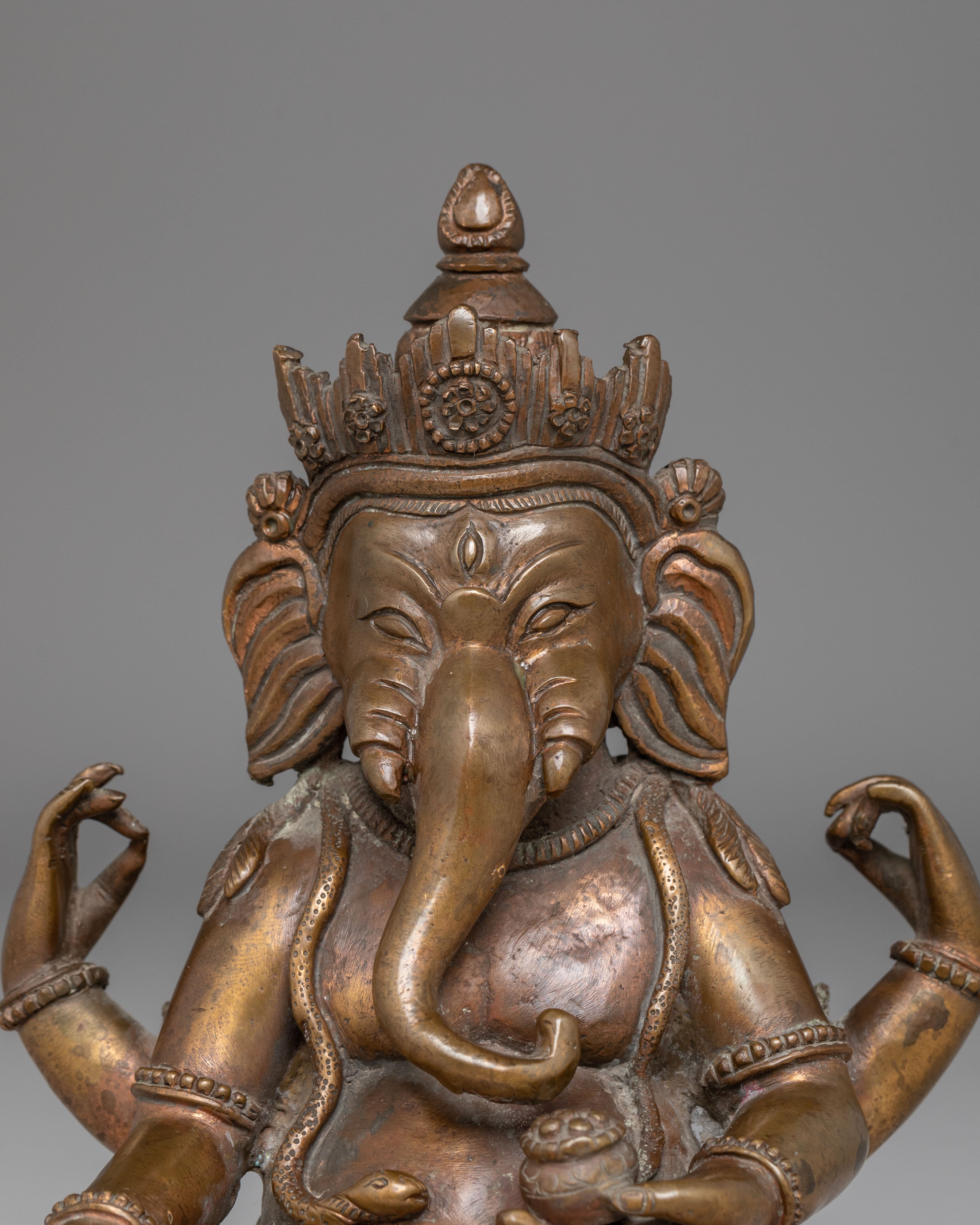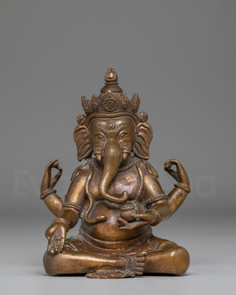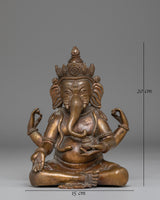 The statue portrays Ganesh in a classic seated position, with his multiple arms holding symbolic objects such as modaks (sweet treats), which represent spiritual offerings, and the axe, symbolizing the removal of obstacles. His elephant head signifies wisdom, and his gentle smile represents the divine joy of removing challenges with compassion. The intricate detailing of his crown, jewelry, and posture reflects traditional craftsmanship and brings a powerful presence to any space. The copper finish enhances the statue's timeless beauty, making it both an aesthetic and spiritual masterpiece.
