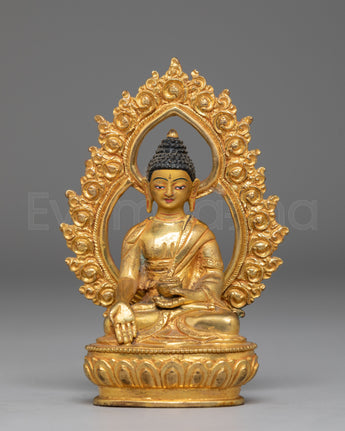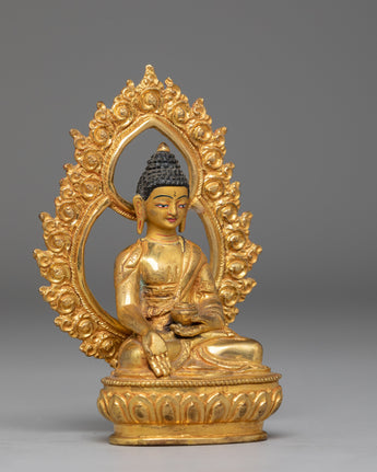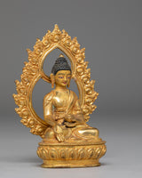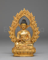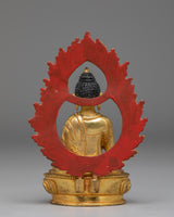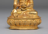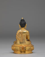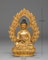 The statue showcases Ratnasabhava Buddha seated in a meditative posture, symbolizing the Buddha's deep wisdom and his capacity to grant prosperity to those who seek spiritual growth. His right hand is held in a gesture of generosity, holding the jewel of spiritual wealth, while his left hand is resting in his lap, symbolizing a state of peace and contemplation. The intricate detailing, from the flowing robes to the lotus base, represents the purity and unbroken cycle of wisdom, wealth, and enlightenment. The gold plating adds a radiant glow, highlighting the divine nature of Ratnasabhava and making it an eye-catching centerpiece for any altar.