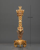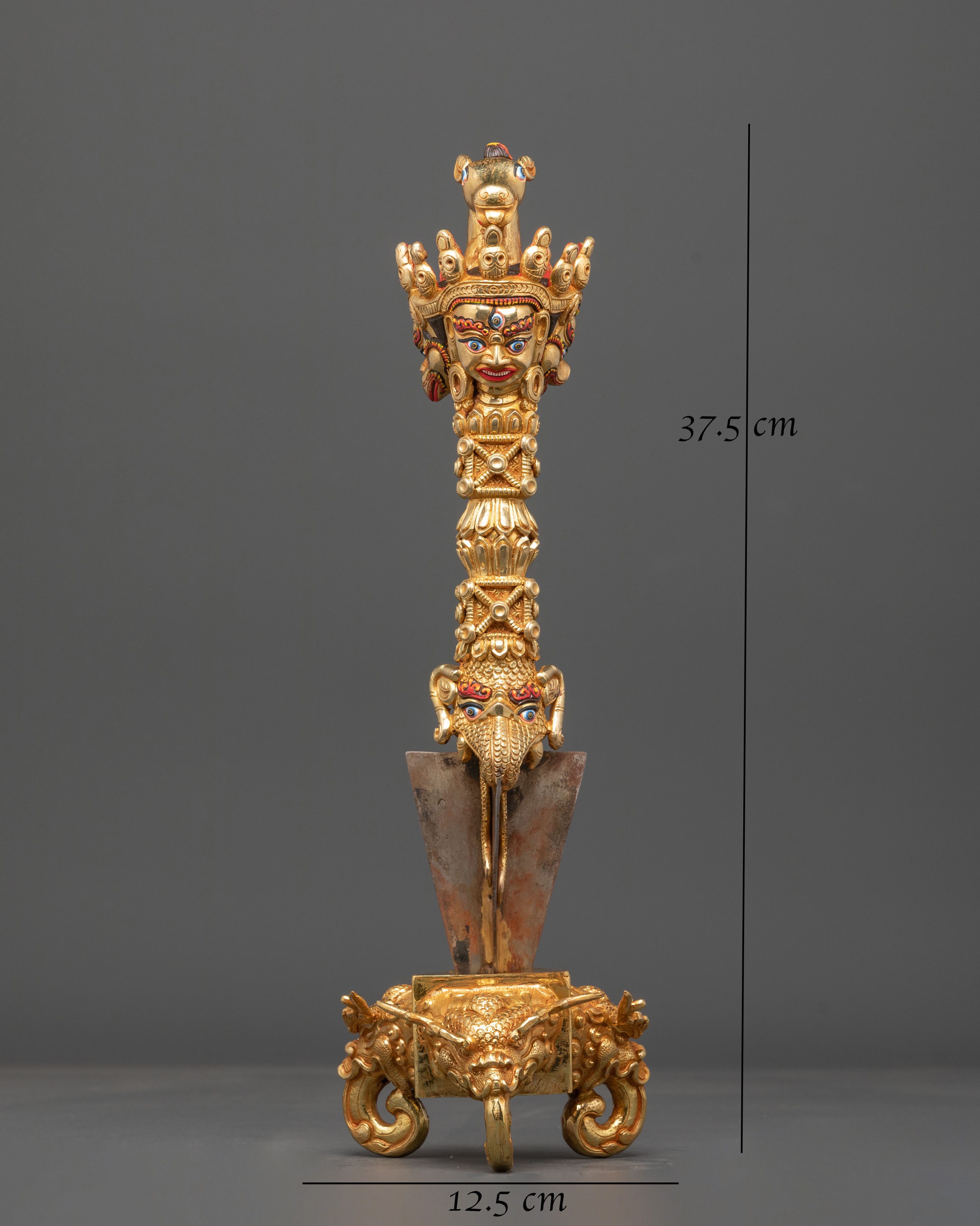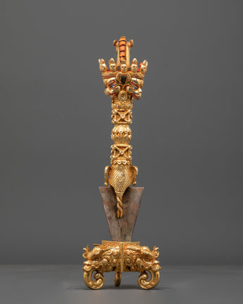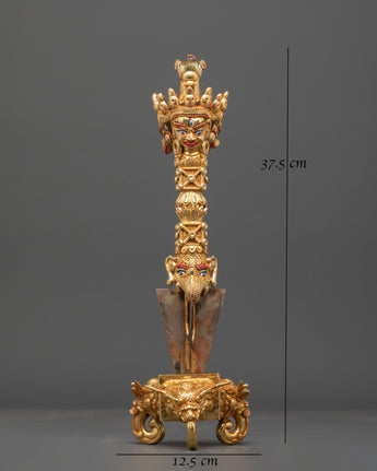 This Tibetan Ritual Phurba (Vajrakila) is a powerful symbol of transformation and spiritual protection. Measuring 37.5cm in height, it is masterfully handcrafted from copper, gold plating, and iron, embodying the deep tantric symbolism found in Vajrayana Buddhism. The Phurba, or ritual dagger, is not a weapon but a sacred tool used to subdue negative forces and cut through ignorance, symbolizing the triumph of wisdom and compassion.