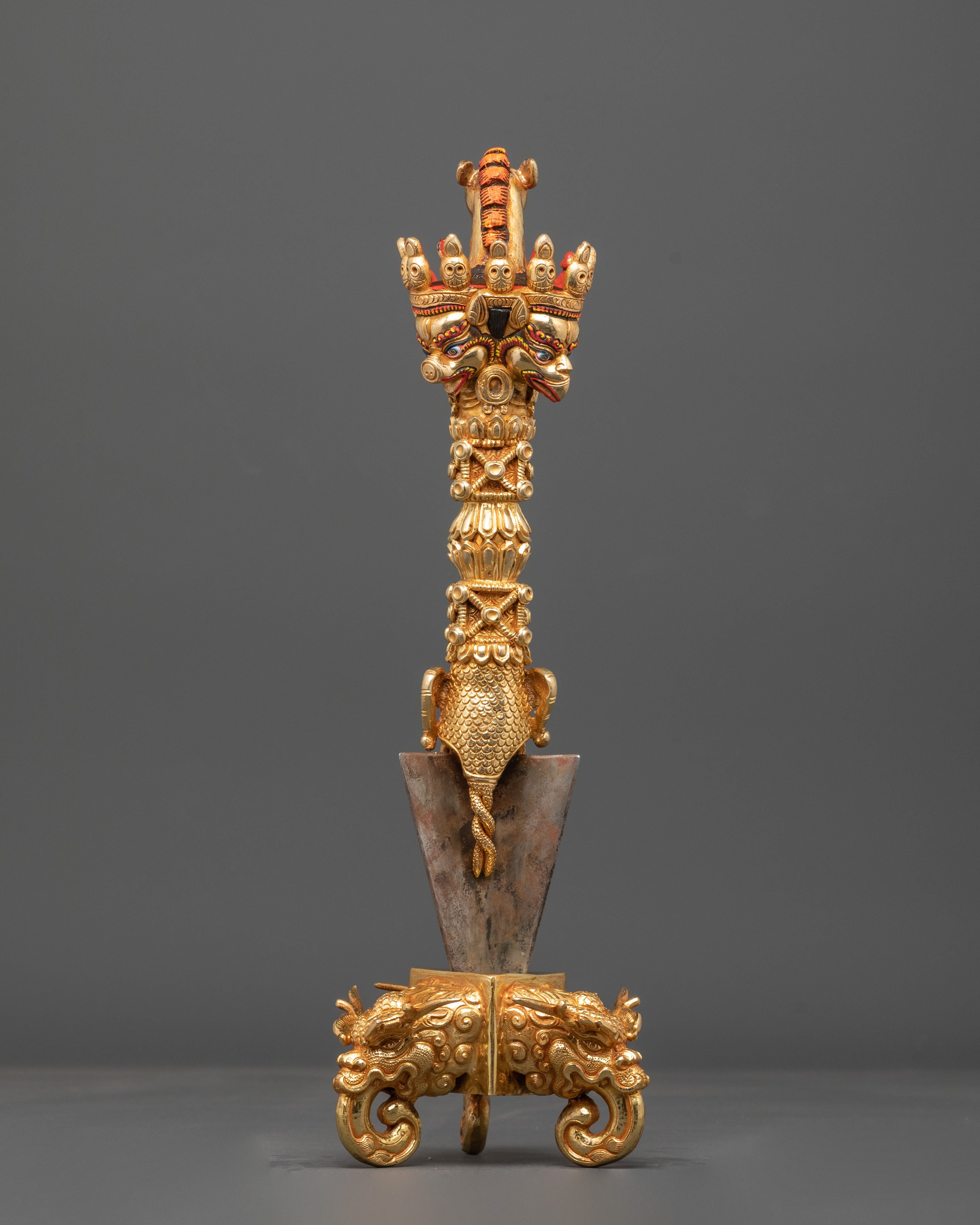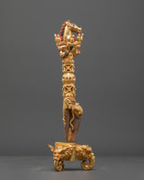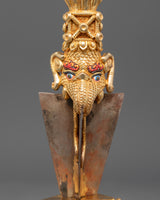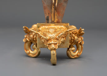The intricate design showcases a three-sided blade, representing the transformation of the three poisons—ignorance, attachment, and aversion—into enlightened awareness. The upper section features finely detailed faces of wrathful deities, embodying the protective energy of the enlightened mind. The combination of gold-plated copper and solid iron gives this Phurba both aesthetic brilliance and ritual authenticity, making it suitable for both practitioners and collectors of sacred Himalayan art.