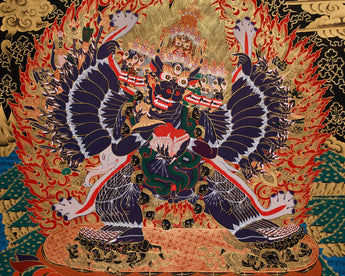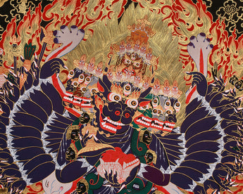 The Supreme Destroyer of Death, Yamantaka Thangka, invokes the fierce wisdom of the wrathful incarnation of Manjushri. Yamantaka, who represents the destruction of ignorance and attachment that bind beings to the cycle of death and rebirth, is portrayed with a fearsome look, multiple faces, and an aggressive demeanor. His numerous faces and arms, showcasing wrathful expressions and symbolic weapons, represent his ability to annihilate ignorance and harmful karmic forces. This gorgeous artwork has been skillfully hand-painted with vibrant acrylic colors, ensuring a rich, long-lasting finish. The thangka's gold detailing on a black canvas creates a bold visual contrast that emphasizes the intricate and sacred imagery surrounding the deity while enhancing his dynamic and fierce presence.
