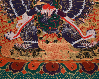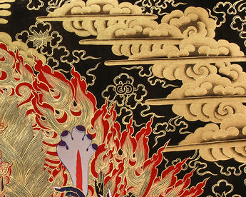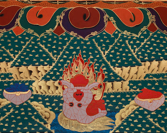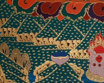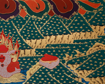 Encircled by blazing flames, his blue body symbolizes the fire of understanding that dispels illusions and opens the door to enlightenment. His main head resembles that of a buffalo, representing unshakable power and the ability to overcome all obstacles. Above his fierce face, the serene head of Manjushri signifies supreme wisdom, which transcends fear and destruction. Swirling clouds in the background of this Thangka illustrate the transience of the material world and the cycle of birth, death, and rebirth. Below him, mountains and patterns resembling flames signify knowledge and enlightenment. These elements guide practitioners toward liberation by emphasizing transformation and purification. This thangka serves as an effective tool for transformation and meditation.