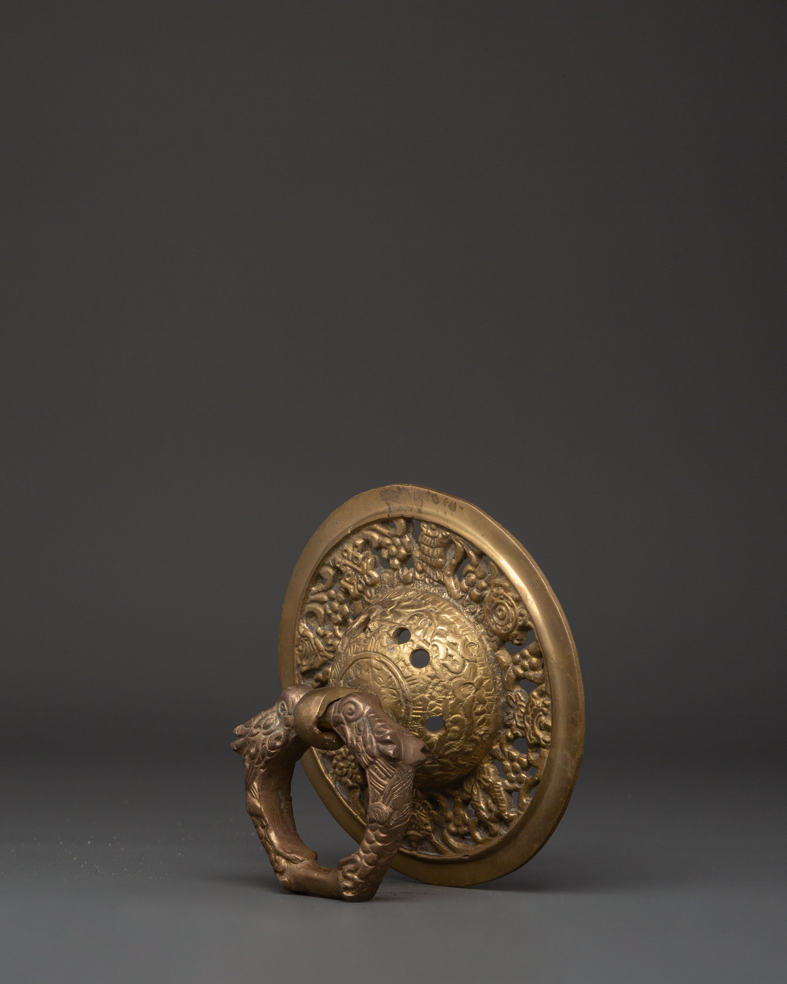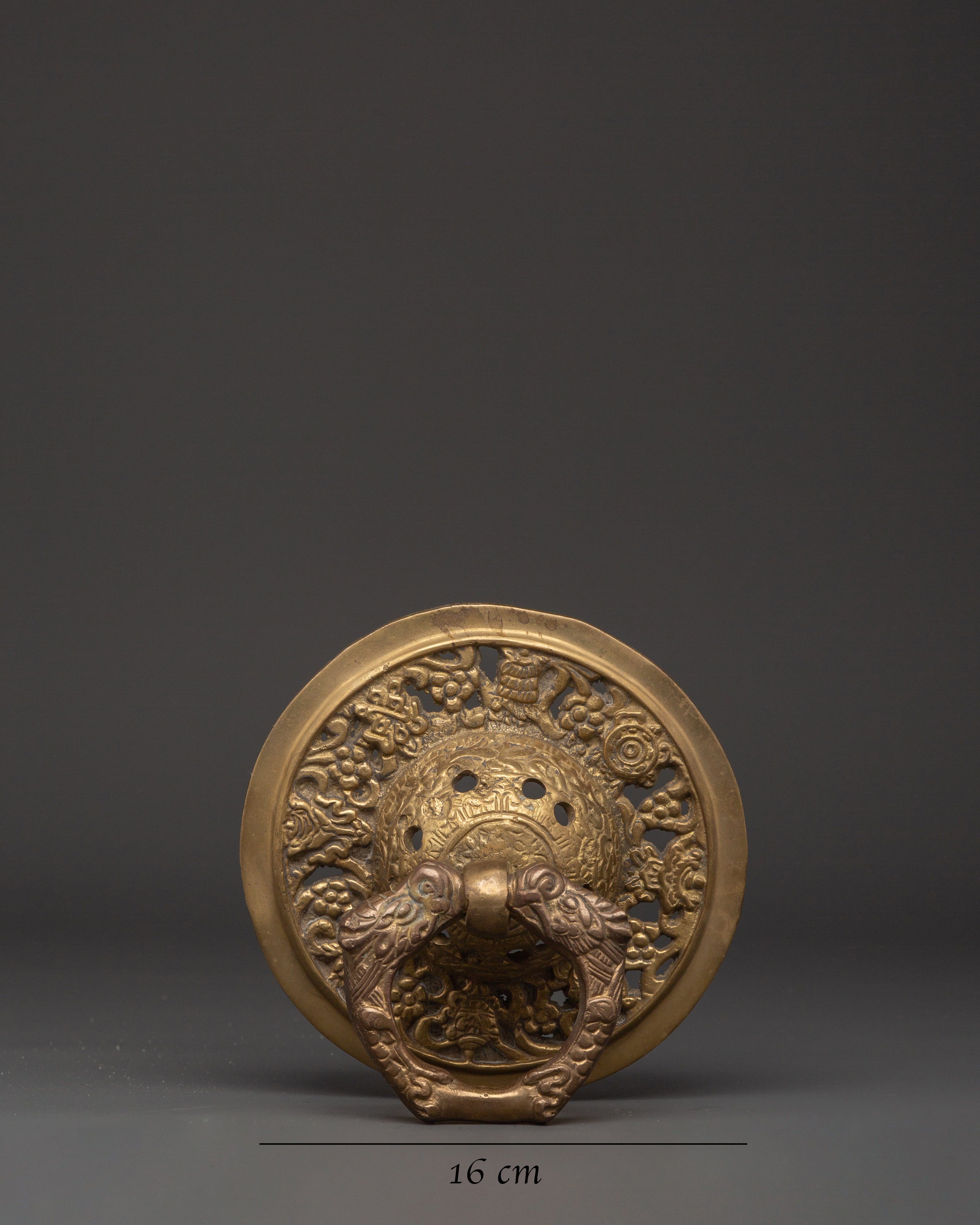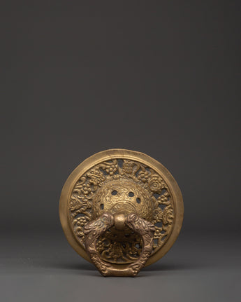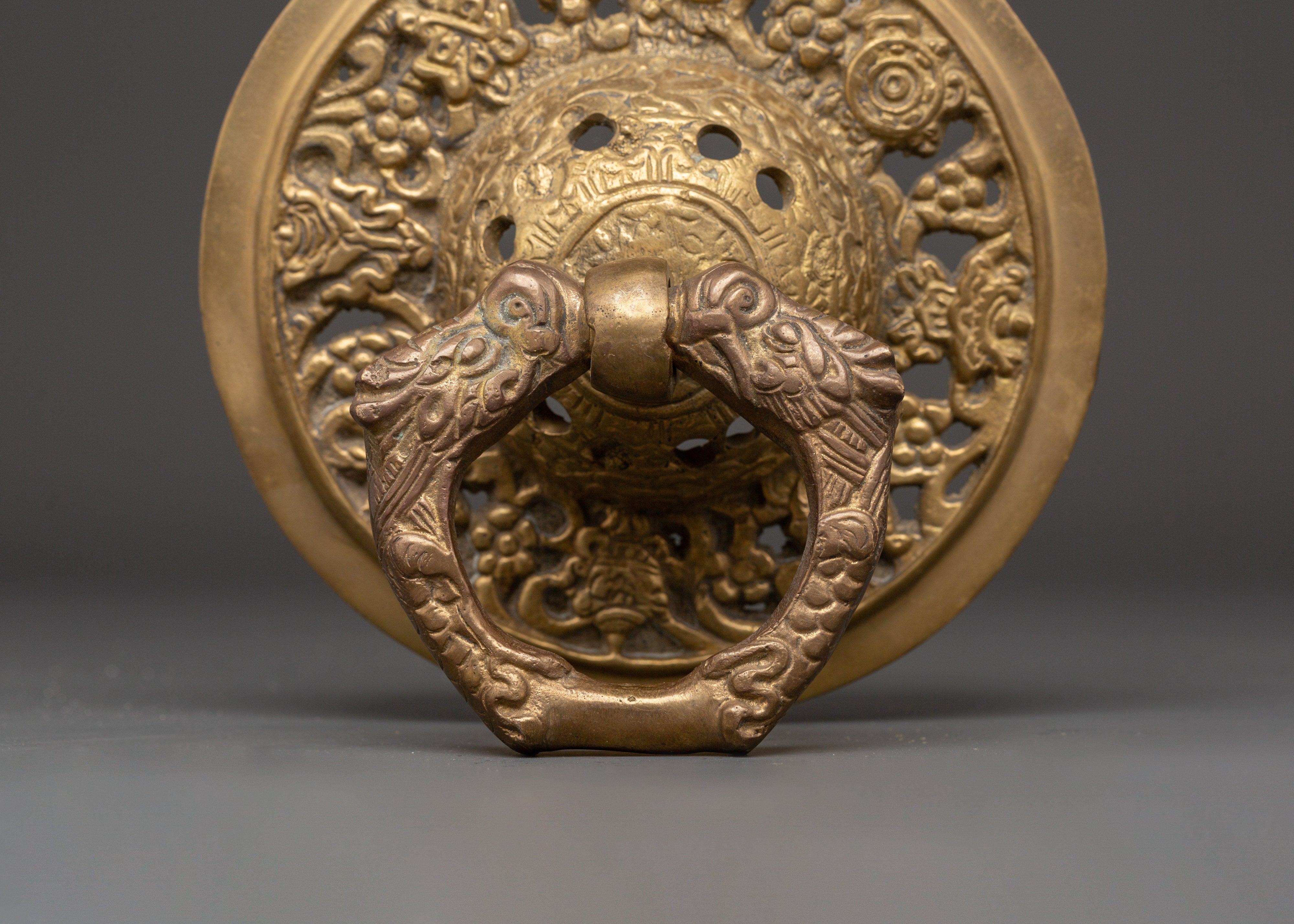 This door knocker set is made of brass. The ring and base have delicate carvings inspired by traditional Tibetan workmanship. The brass finish creates a warm, sacred appeal, while the construction ensures stability in regular use. This set is ideal for modern and traditional architectural types, adding a grand and welcome touch to the entry.