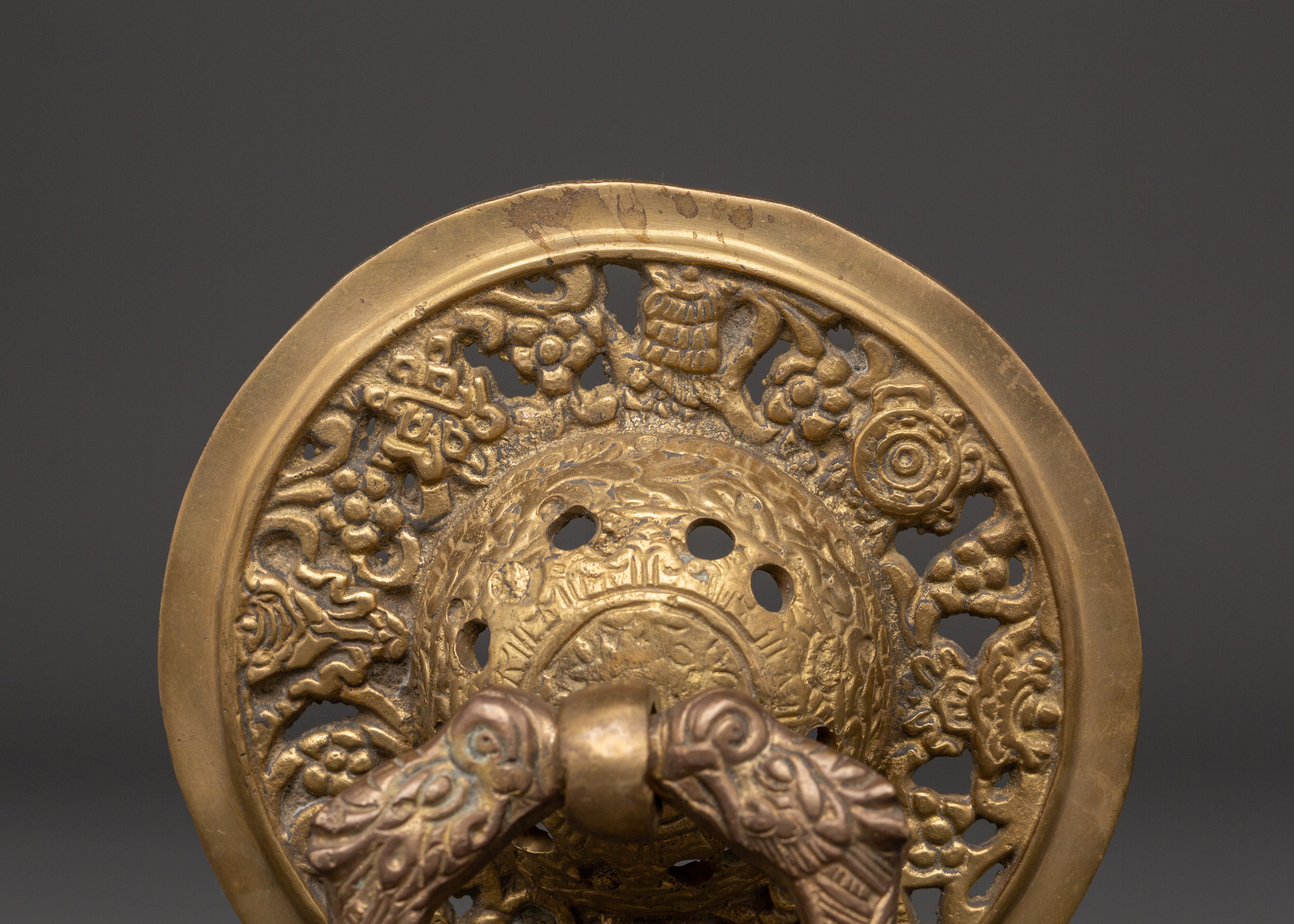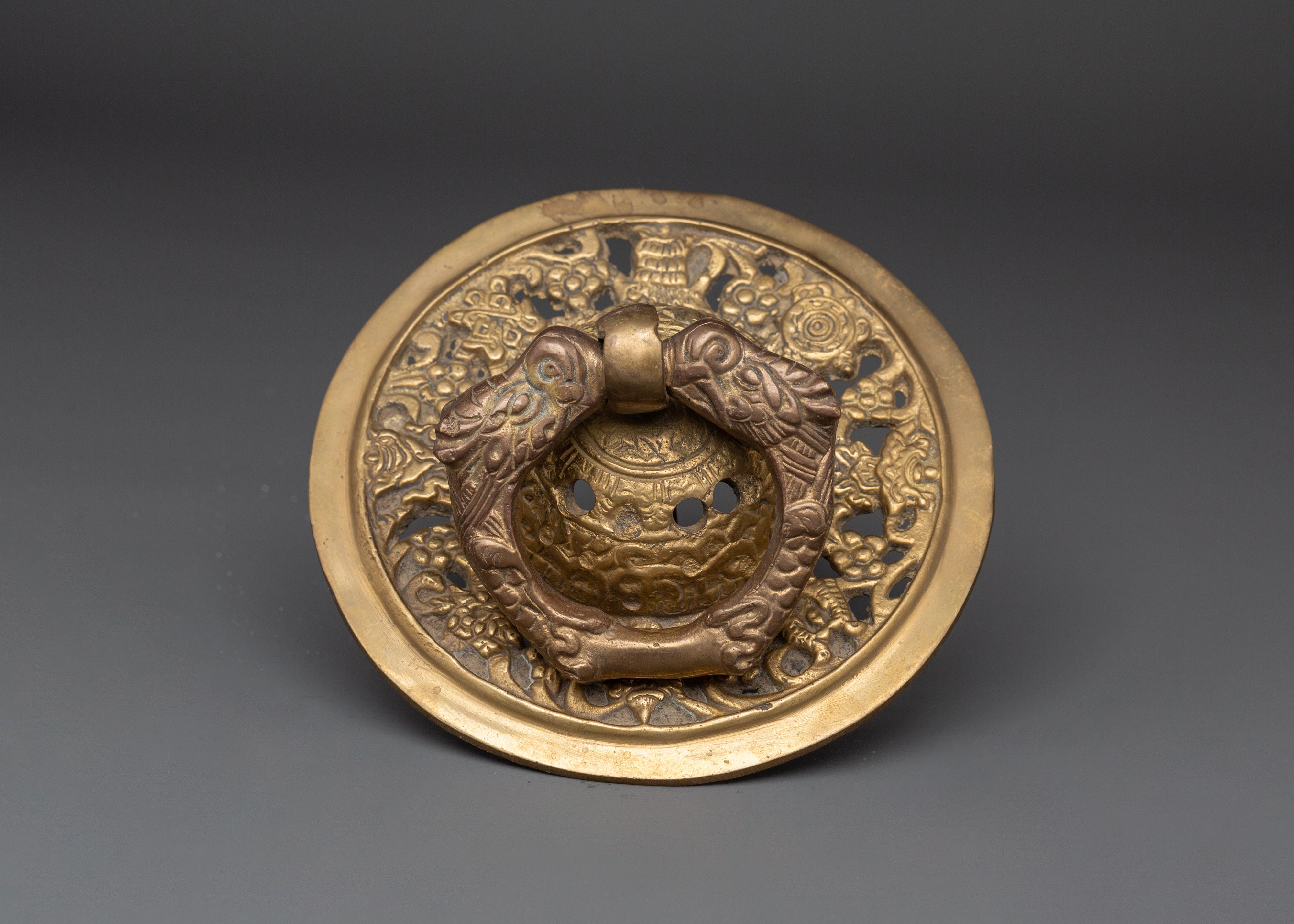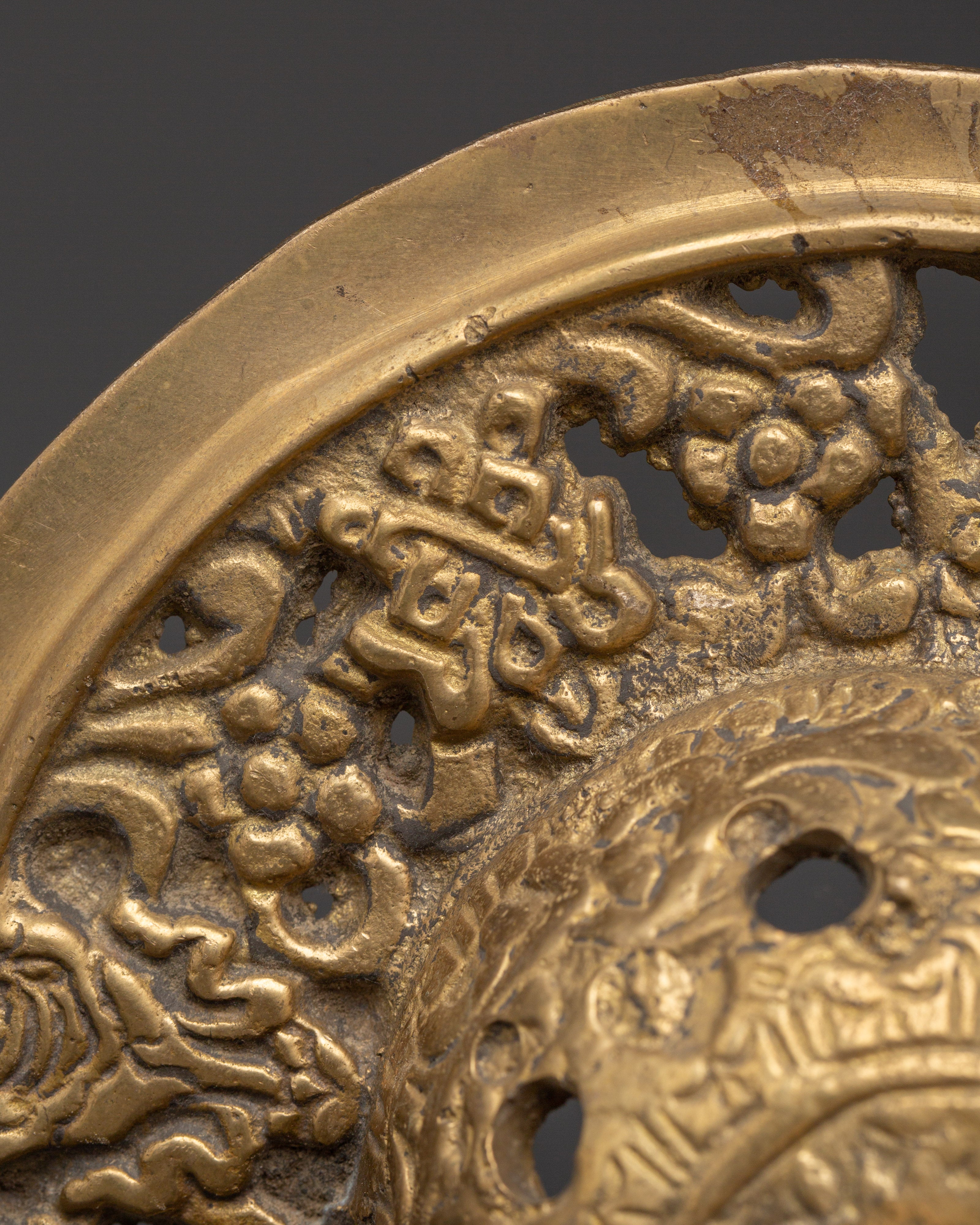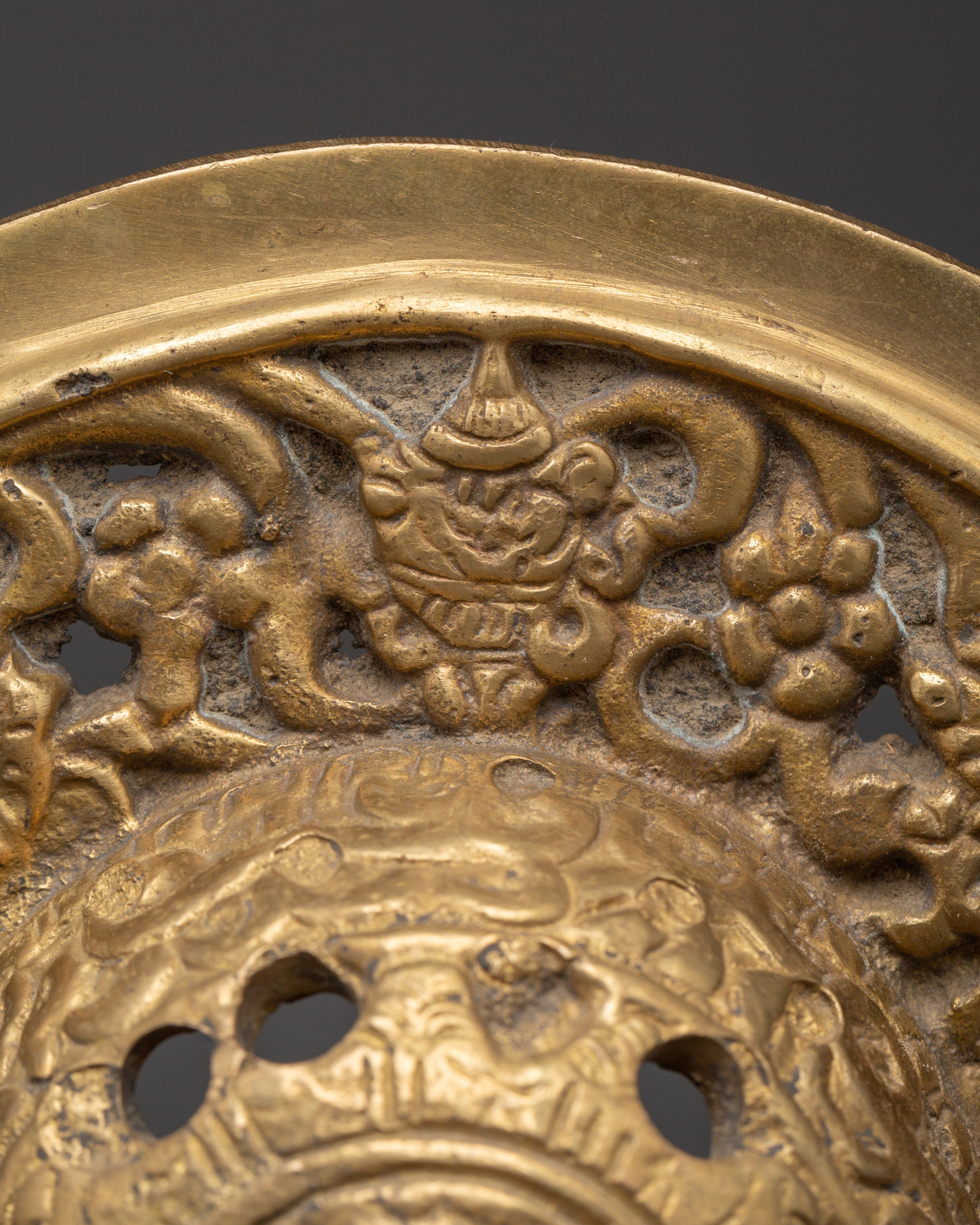 This door knocker set is made of brass. The ring and base have delicate carvings inspired by traditional Tibetan workmanship. The brass finish creates a warm, sacred appeal, while the construction ensures stability in regular use. This set is ideal for modern and traditional architectural types, adding a grand and welcome touch to the entry.