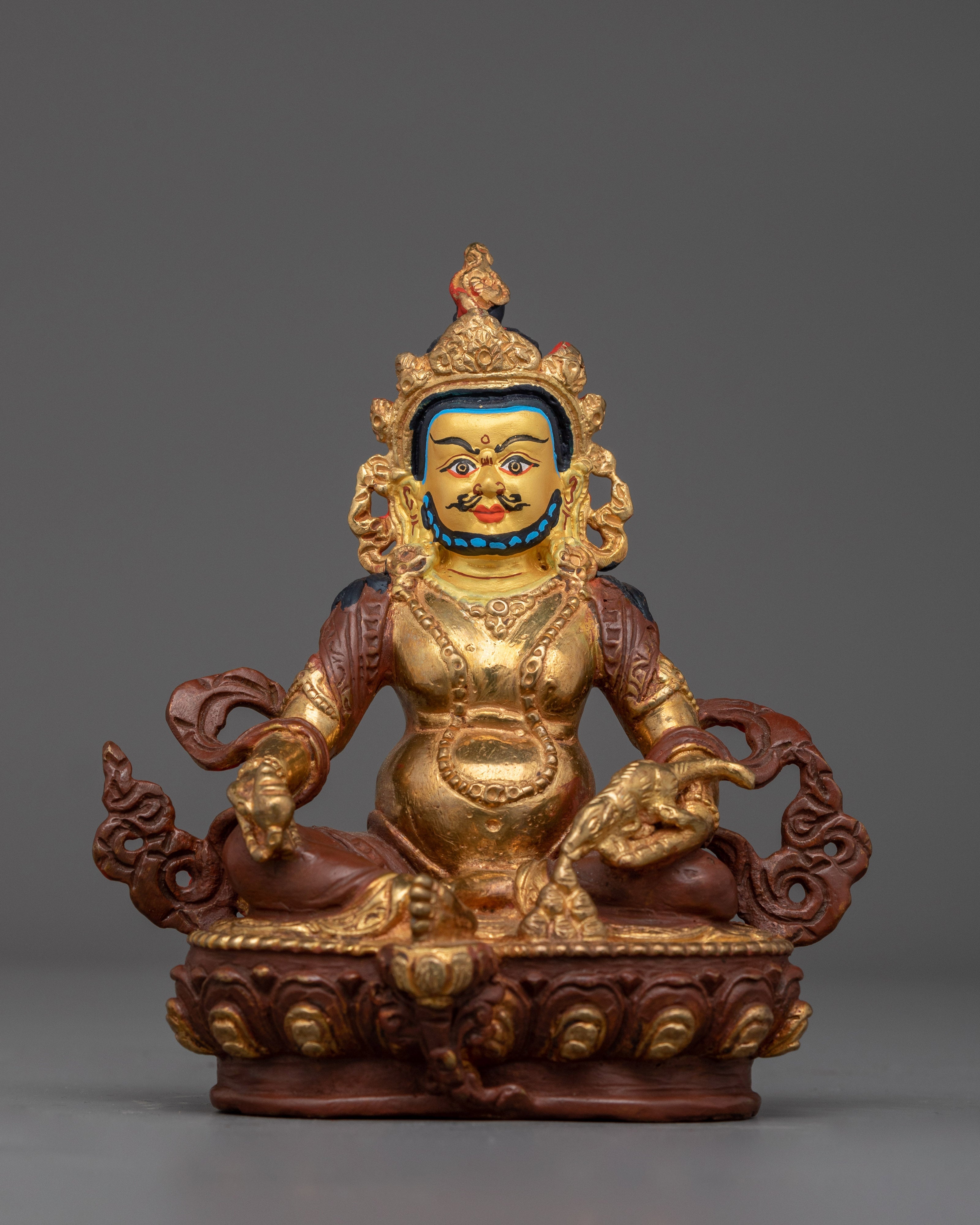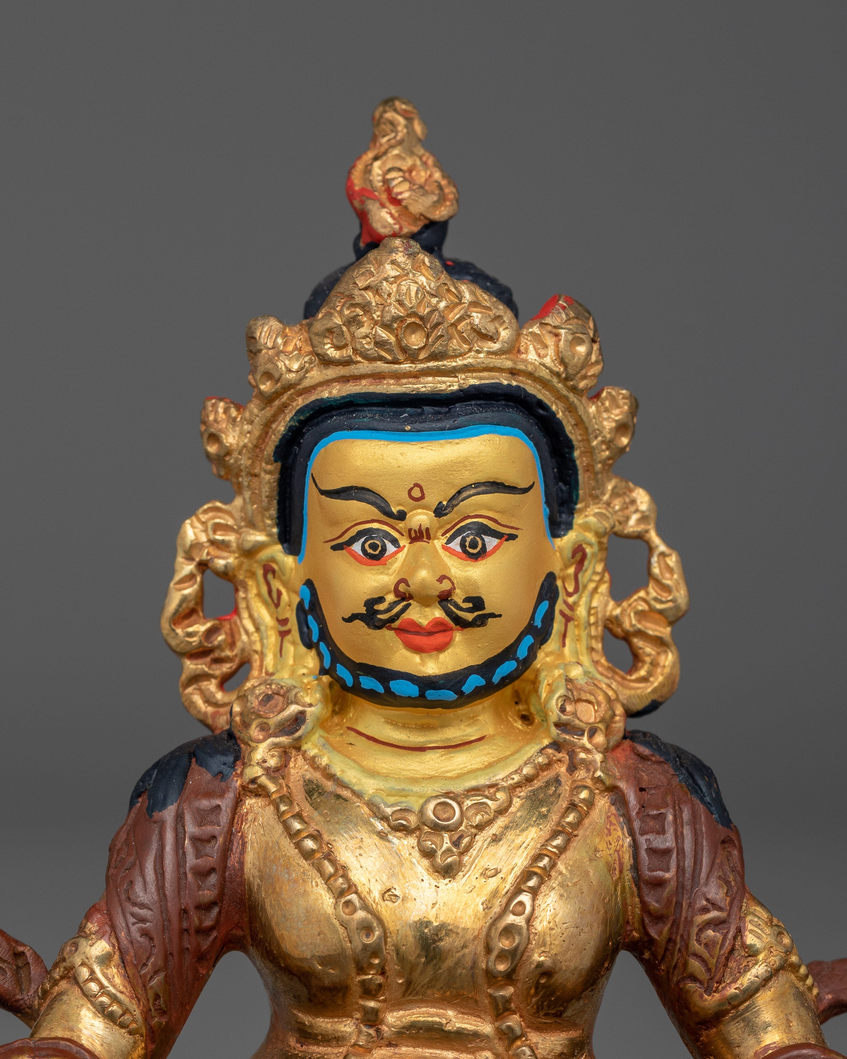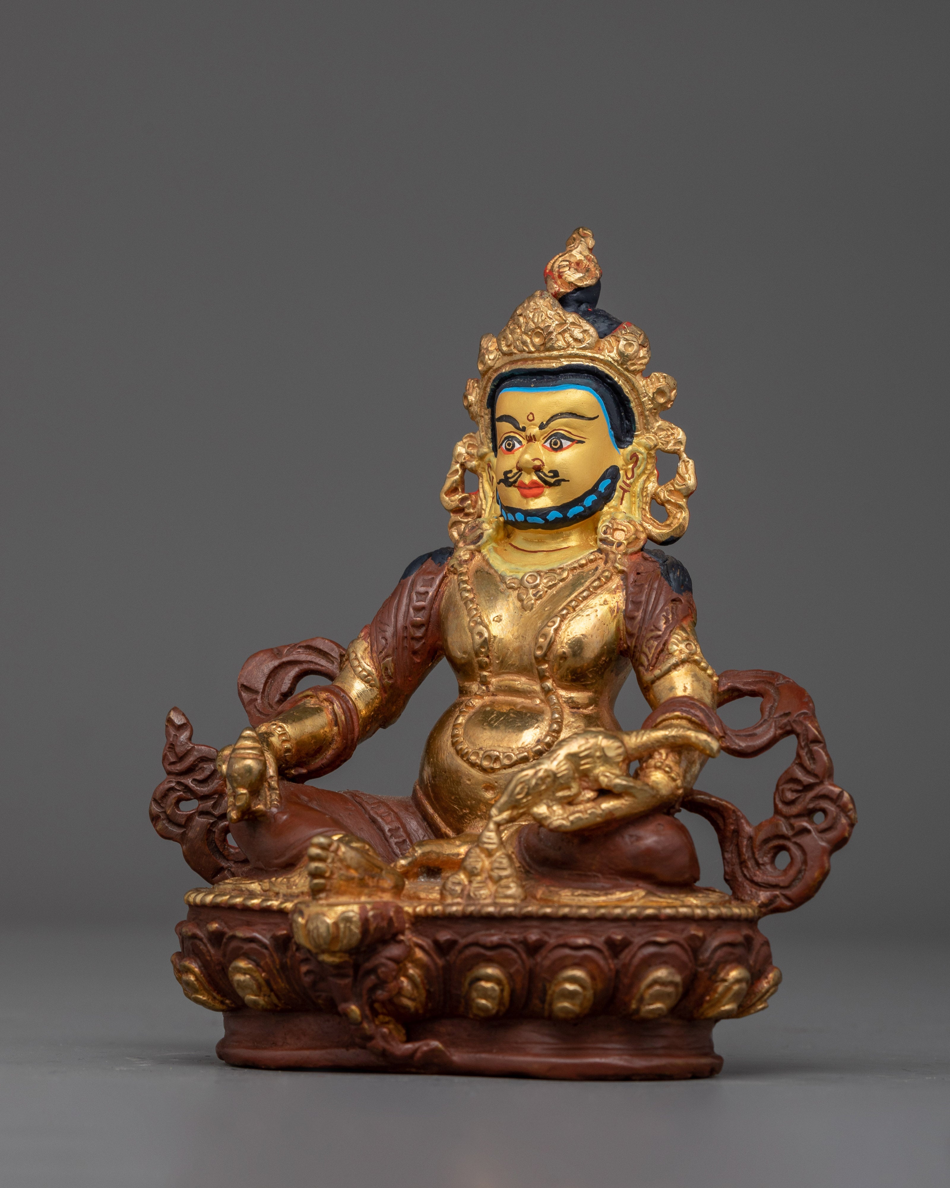Dzambhala, also known as Jambhala, is a Bodhisattva of wealth and prosperity in Tibetan Buddhism. He is recognized for his ability to alleviate poverty and promote prosperity among practitioners. Dzambhala is frequently depicted with a tranquil yet powerful countenance, holding a mongoose that spews glittering diamonds, symbolizing the never-ending flow of wealth and generosity he bestows upon his followers.