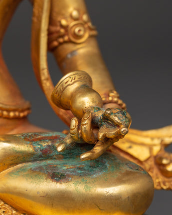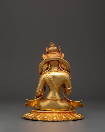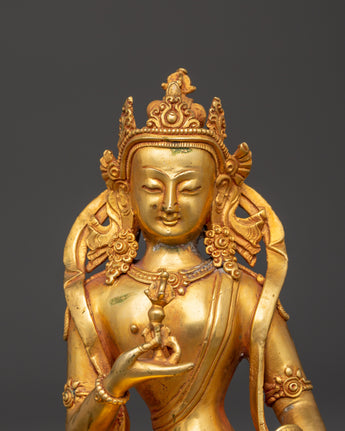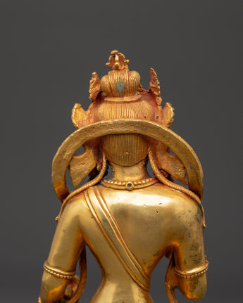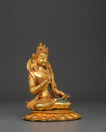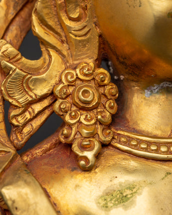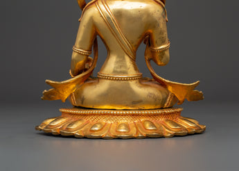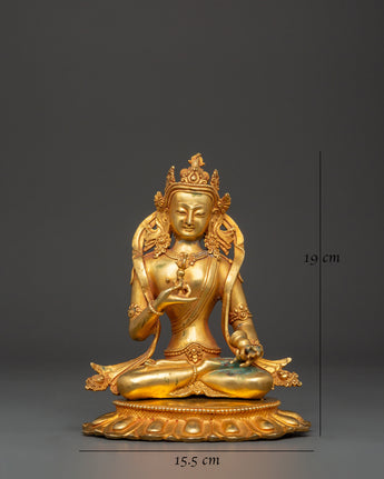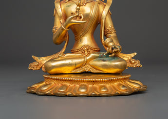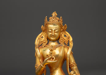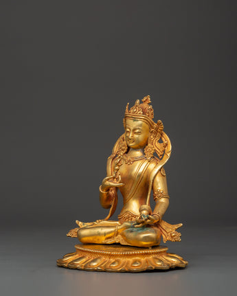 This statue's handmade features highlight Vajrasattva's peaceful look and royal posture, which is enhanced by exquisite embellishments and a lotus base. The gold-plated copper surface emanates an enchanting aura, making it great for altars, meditation places, or as a special spiritual present. Whether utilized for daily meditation or as a beautiful addition to your holy space, this statue exudes profound peace and spiritual connection.