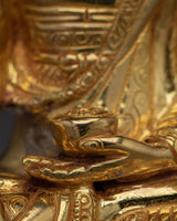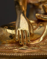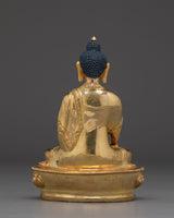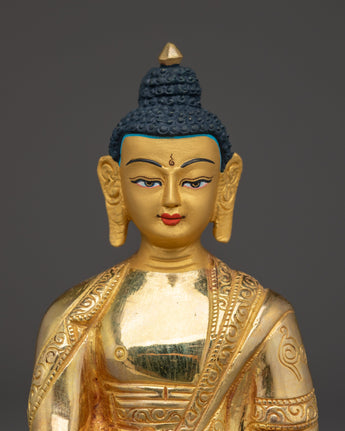 Enlightened Sage Icon Shakyamuni Buddha stands 5.9 inches (15 cm) tall with a 4.1-inch (10.5 cm) wide base and weighs 0.57 kilograms. Skillfully made from a copper body, it is enriched with 24K gold gilding and accentuated by delicate gold and acrylic paintings. Despite its compact size, it radiates the depth and elegance of traditional Himalayan artistry, perfect for personal altars, travel shrines, or intimate meditation spaces.
