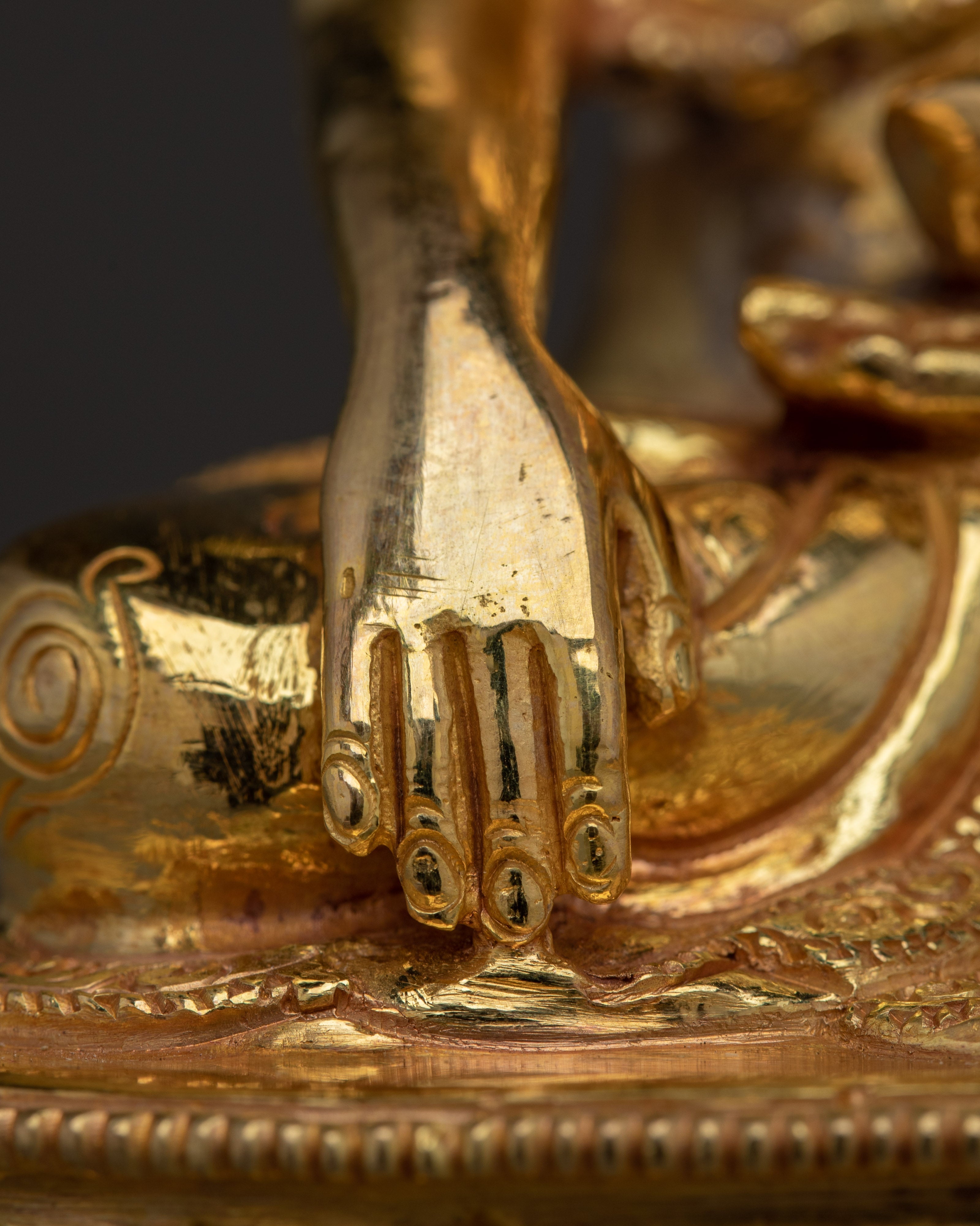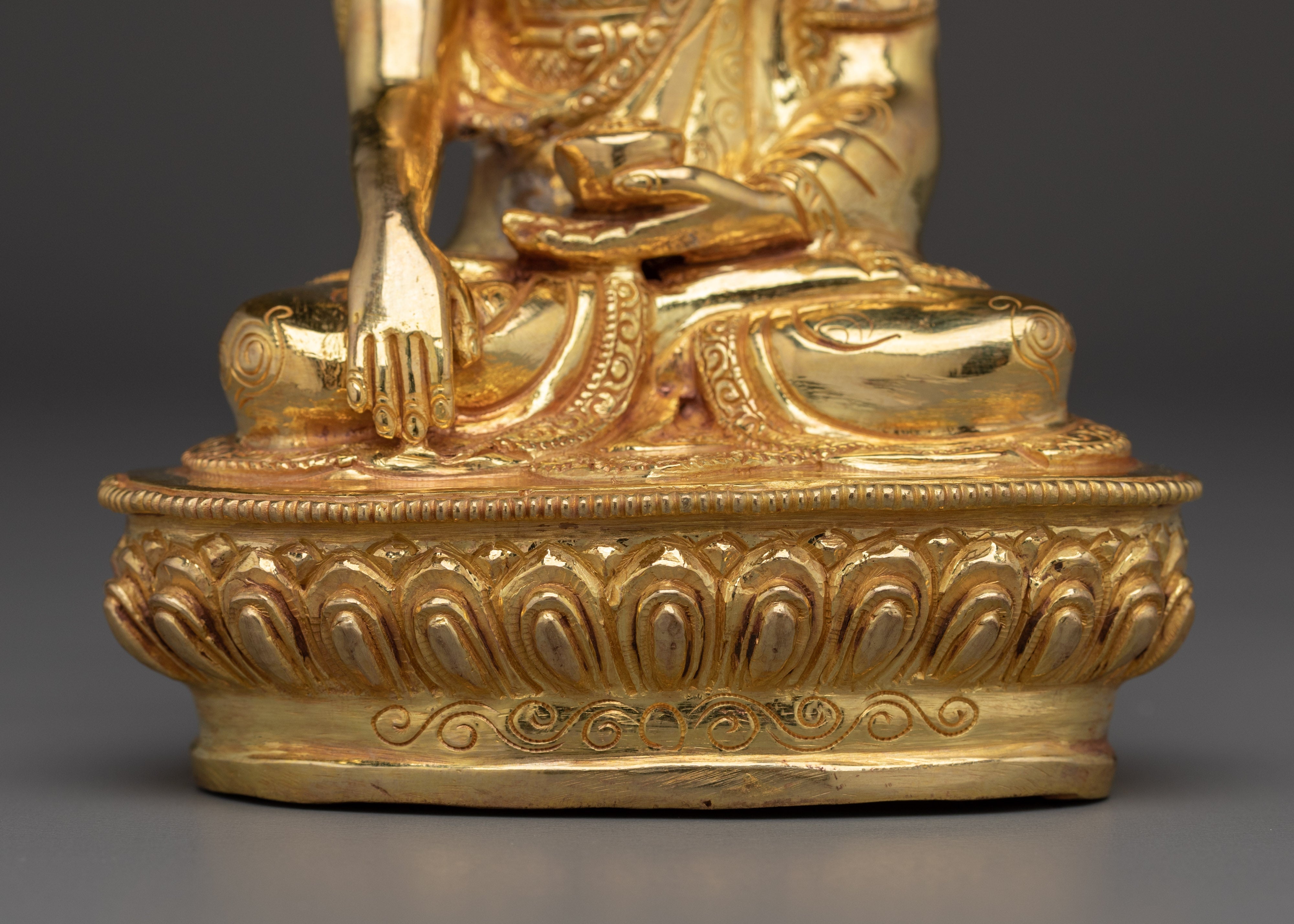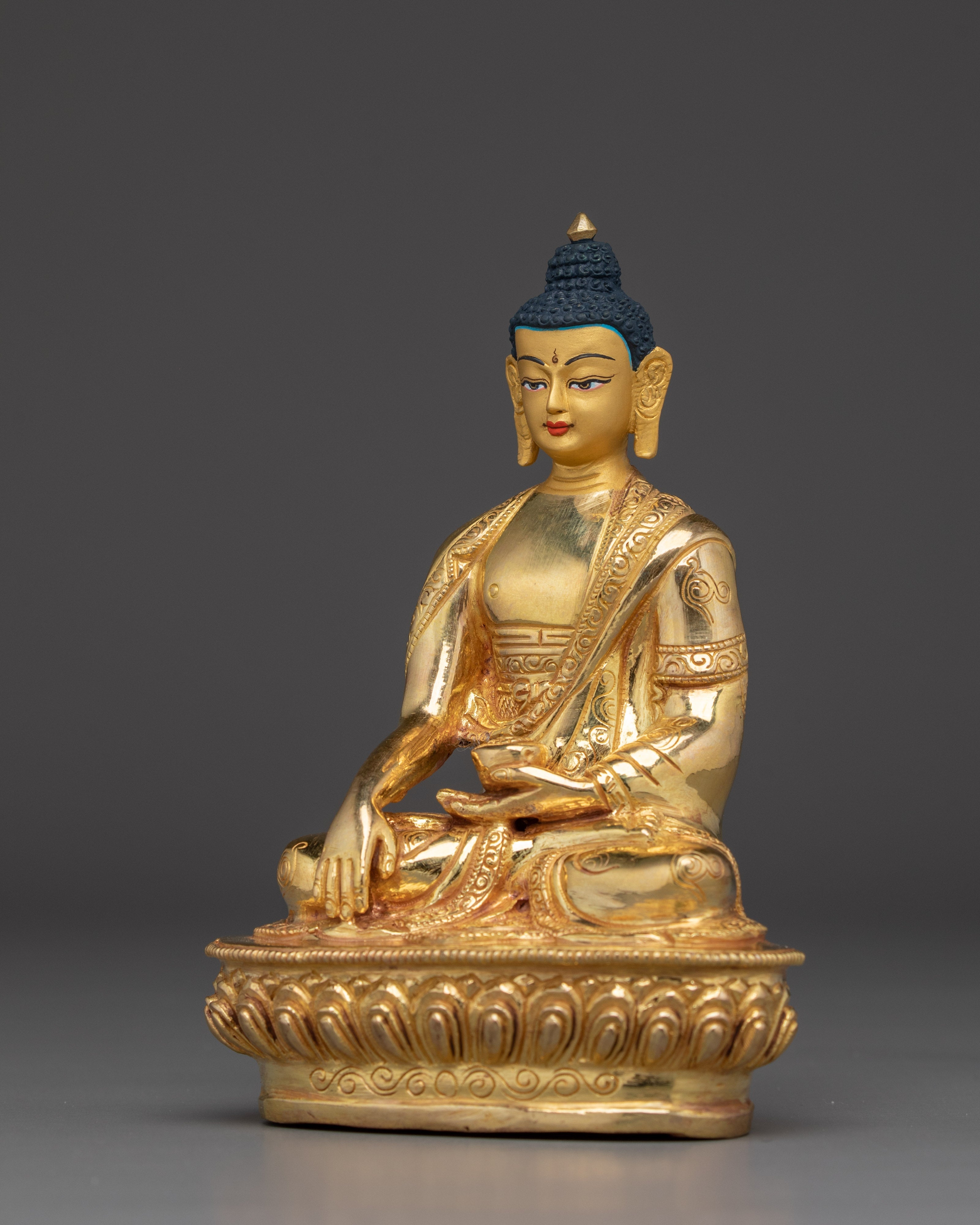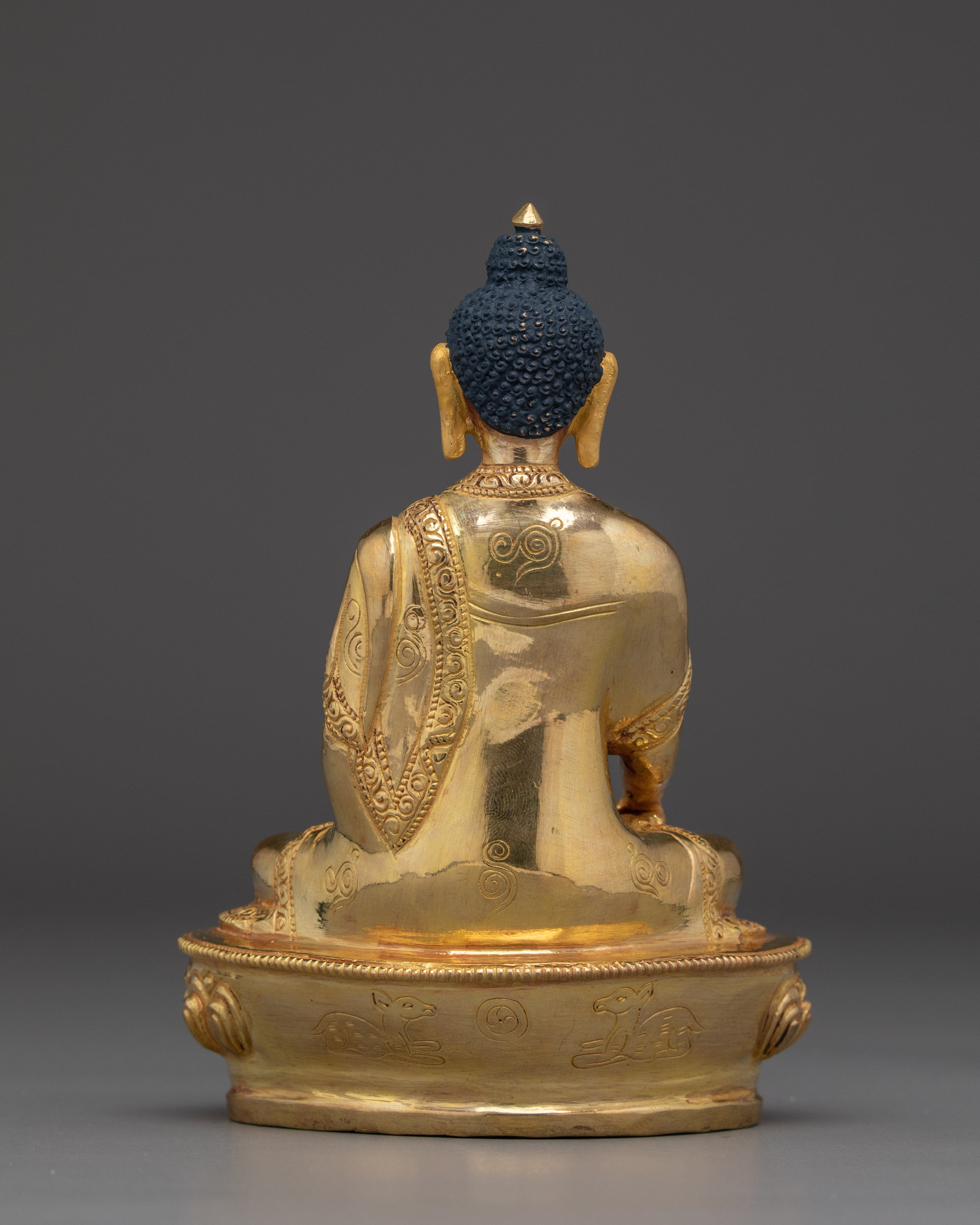 The statue portrays Shakyamuni Buddha seated in padmasana (lotus posture) atop a lotus base, symbolizing purity and spiritual awakening. His right hand is shown in the bhumisparsha mudra (earth-touching gesture), representing the moment of his enlightenment when he called the earth to witness his awakening. The left hand gently holds a begging bowl, signifying renunciation and the monastic lifestyle.