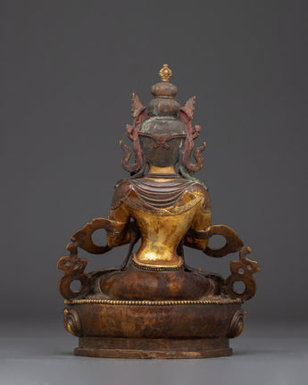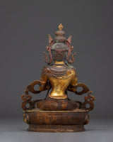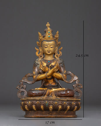 The Enlightenment Symbol Vajradhara is 24.5cm in height, 17cm in width, and weighs 2.41kg. This statue, made of oxidized copper and embellished with gold plating and faux turquoise stones, depicts Vajradhara, the primordial Buddha and embodiment of ultimate enlightenment. Vajradhara, a revered figure in Tibetan Buddhism, represents wisdom, compassion, and spiritual force, and serves as a guide for practitioners seeking insight and inner development. This intricately crafted statue is perfect for altars, meditation places, and holy nooks, as it exudes divine energy and spiritual presence.
