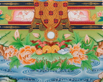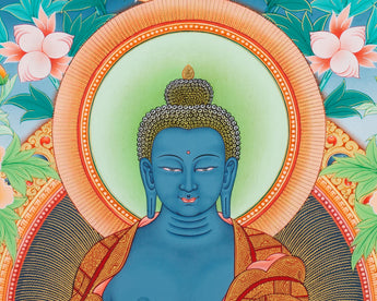 The Bhaisajyaguru Healing Art is a remarkable exhibition of traditional artistry, painted in the refined Eri Style, which is characterized by its harmonious composition, intricate brushwork, and beautiful color transitions. High-quality acrylic paints are carefully layered in several fine layers to create the thangka on durable cotton canvas. This approach allows the artist to achieve tonal depth and bright vibrancy, particularly when depicting the Buddha's serene blue body, the soft folds of his robes, and the radiant surroundings. Furthermore, by adding dimension and clarity that enhance the scene's overall harmony, the acrylics enliven the surrounding landscape, which features lush greens, vibrant flowers, and the gentle glow of the sky. The lotus throne and halo are expertly embellished with genuine 24K gold, highlighting the deity's sacred presence and creating a striking contrast with the cooler hues.