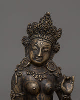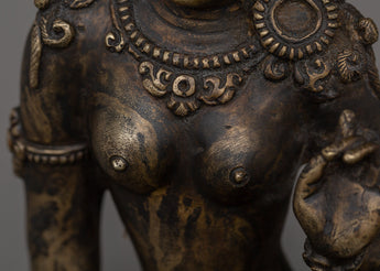 The Feminine Energy Green Tara Statue is a meticulously crafted representation of the Bodhisattva of Compassion, measuring 6.5 inches (16.5 cm) in height and 4.3 inches (11 cm) in diameter at the base. Made from a copper body, this statue features an antique finish, giving it a timeless and spiritual appearance.