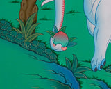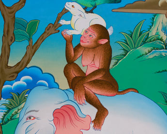 In this painting, the lush greenery and serene natural surroundings further symbolize the flourishing of peace when different beings unite for mutual benefit. The use of acrylic colors and gold accents adds vibrancy and depth to this peaceful scene, while the traditional painting style honors the rich heritage of Nepali art. This thangka serves as a stunning depiction of Buddhist principles, also reminding us of the importance of collaboration and mutual respect.