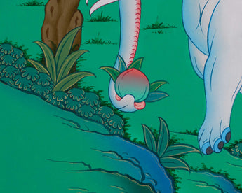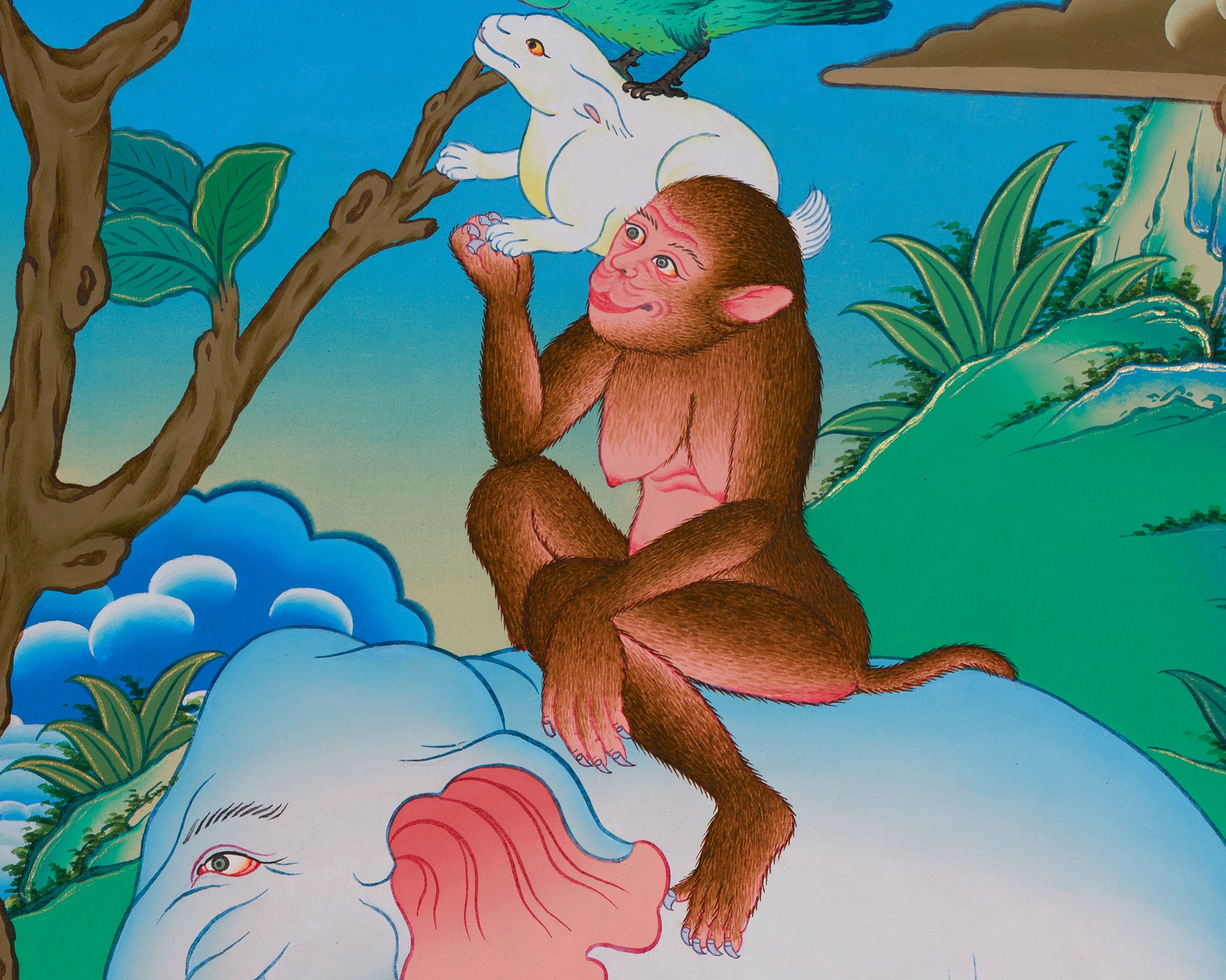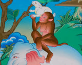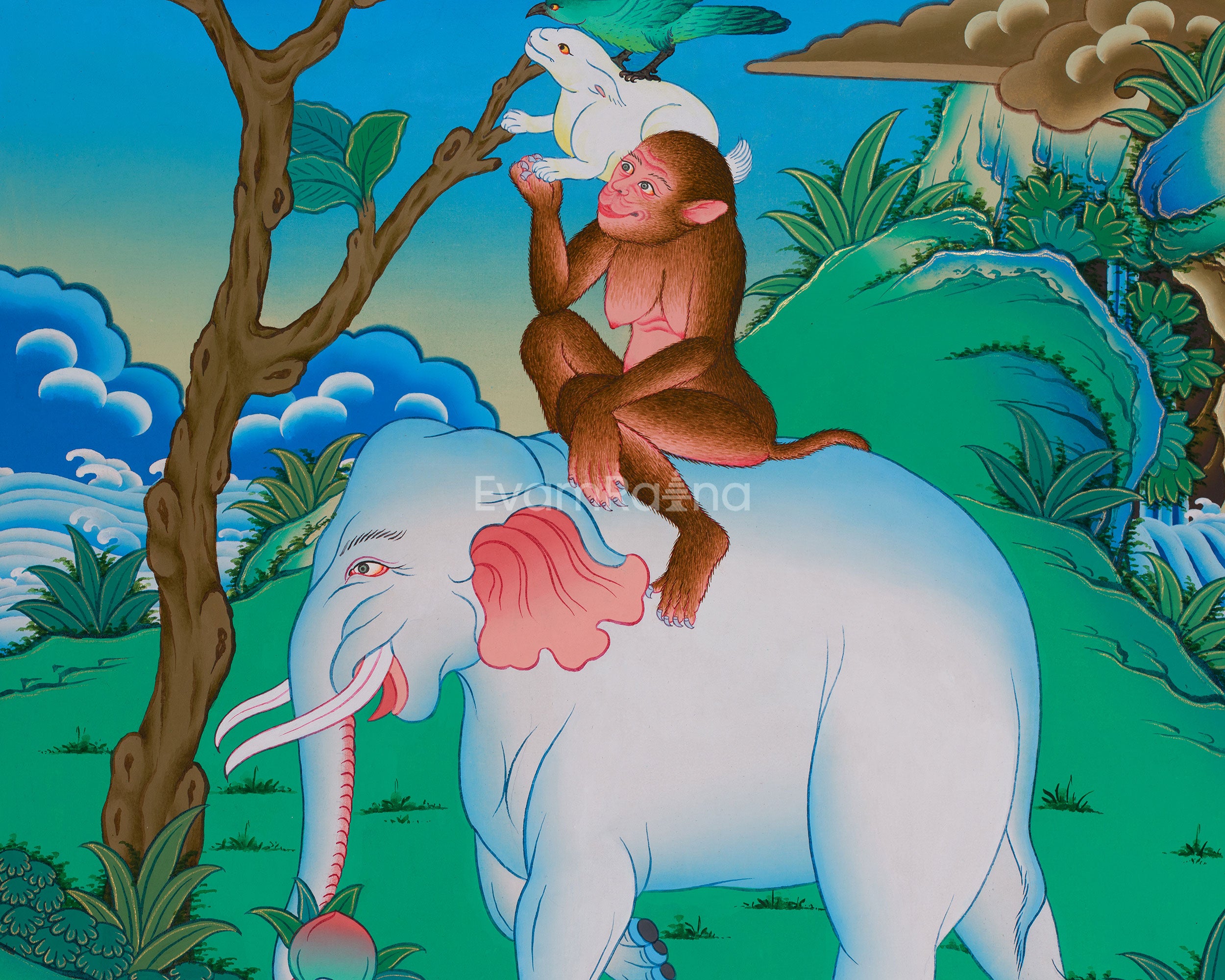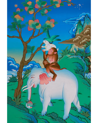 The Four Harmonious Friends is a beautiful Buddhist tale that reminds us of the interconnectedness of everything in nature and how different species can coexist peacefully. The artwork depicts a cheerful scene where an elephant, a monkey, a bird, and a rabbit share a peaceful moment. You can see the monkey resting on the elephant’s back, the rabbit sitting safely on the monkey, and the bird happily engaging with the scene, symbolizing their harmony. This lovely depiction teaches us that when animals live peacefully together, it helps create a calm and balanced world.