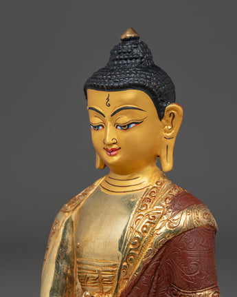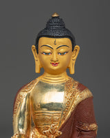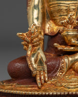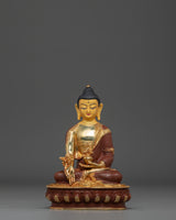 This golden Buddhist healing Buddha, Bhaisajyaguru statue, stands at 8.1”/20.5cm in height and 5.5”/14cm at the base, weighing 1.27 kg. Made from copper and adorned with 24K gold gilding, gold and acrylic paintings, it reflects traditional craftsmanship and spiritual symbolism. Expertly crafted by skilled Nepali artisans, it makes a meaningful addition to altars, meditation spaces, or personal collections focused on health, well-being, and inner peace.