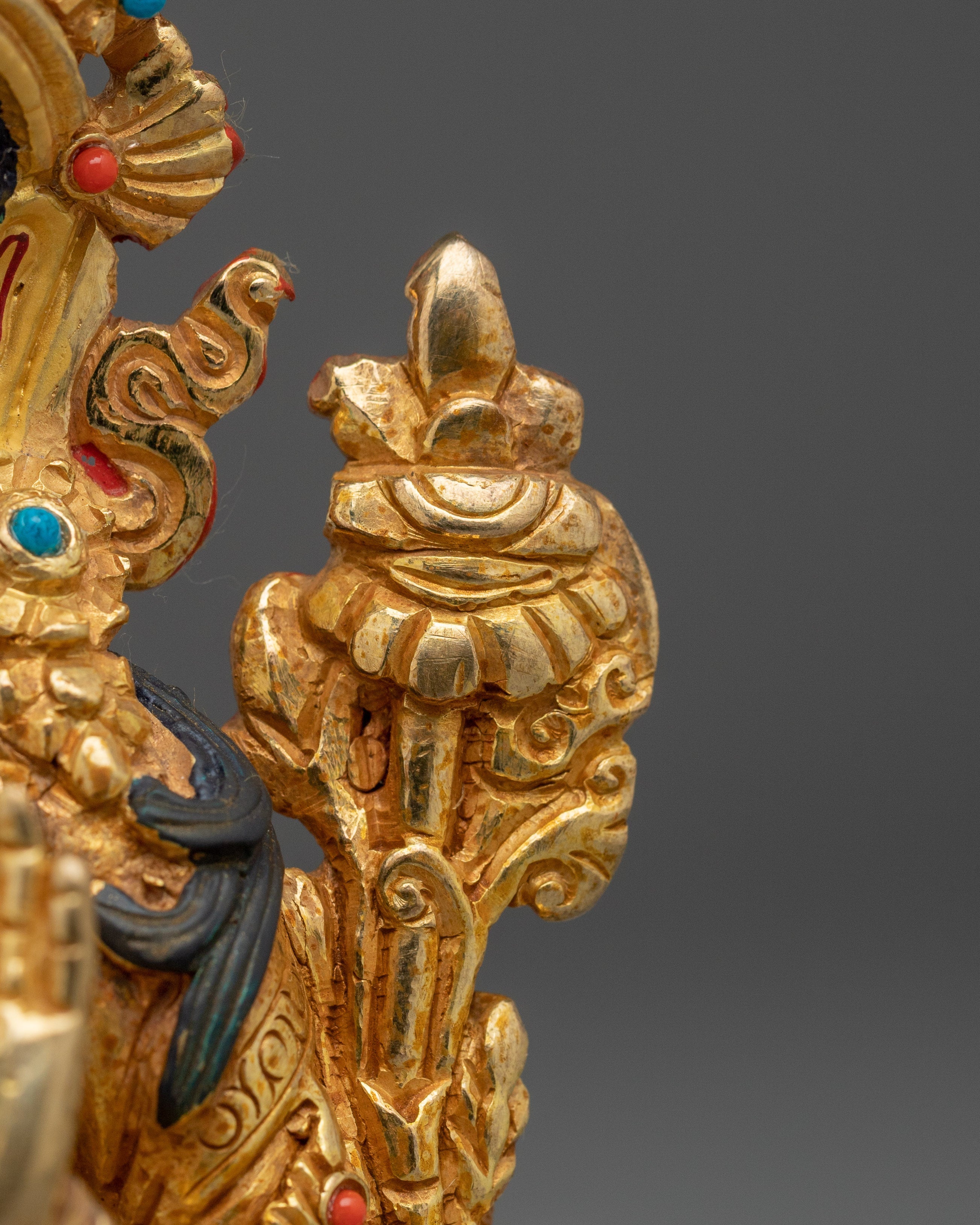 This peaceful, golden handmade statue of Manjushri stands 5.7”/14.5cm tall, with a base width of 3.9”/10cm, and weighs 0.54 kg. Finely handcrafted from a copper body, it is richly adorned with 24K gold gilding, gold and acrylic paintings, and inlaid with gemstones. Manjushri, the Bodhisattva of Wisdom, is honored for his embodiment of profound insight and clarity of mind. This compact yet detailed statue is ideal for personal meditation spaces, study areas, or sacred collections seeking to cultivate wisdom, focus, and spiritual depth.
