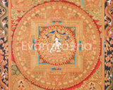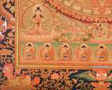 The Sita Tara Mandala, as depicted in this thangka, is a sacred representation of Tara, a well-known character in Tibetan Buddhism recognized for her protective and nurturing nature. White Tara is centered in this mandala in her typical meditative posture, her serene face radiating grace and wisdom. The lotus seat she occupies symbolizes purity and the emergence of spiritual wisdom. The mandala's vibrant colors and genuine 24K gold detailing, particularly around Tara's figure and the symbols of protection, provide the composition with remarkable depth and bring Tara's spirit to life. Furthermore, the painting's rich color palette, which features reds, yellows, and greens, not only enhances the deity's loving qualities but also evokes feelings of safety, spiritual healing, and enlightenment.